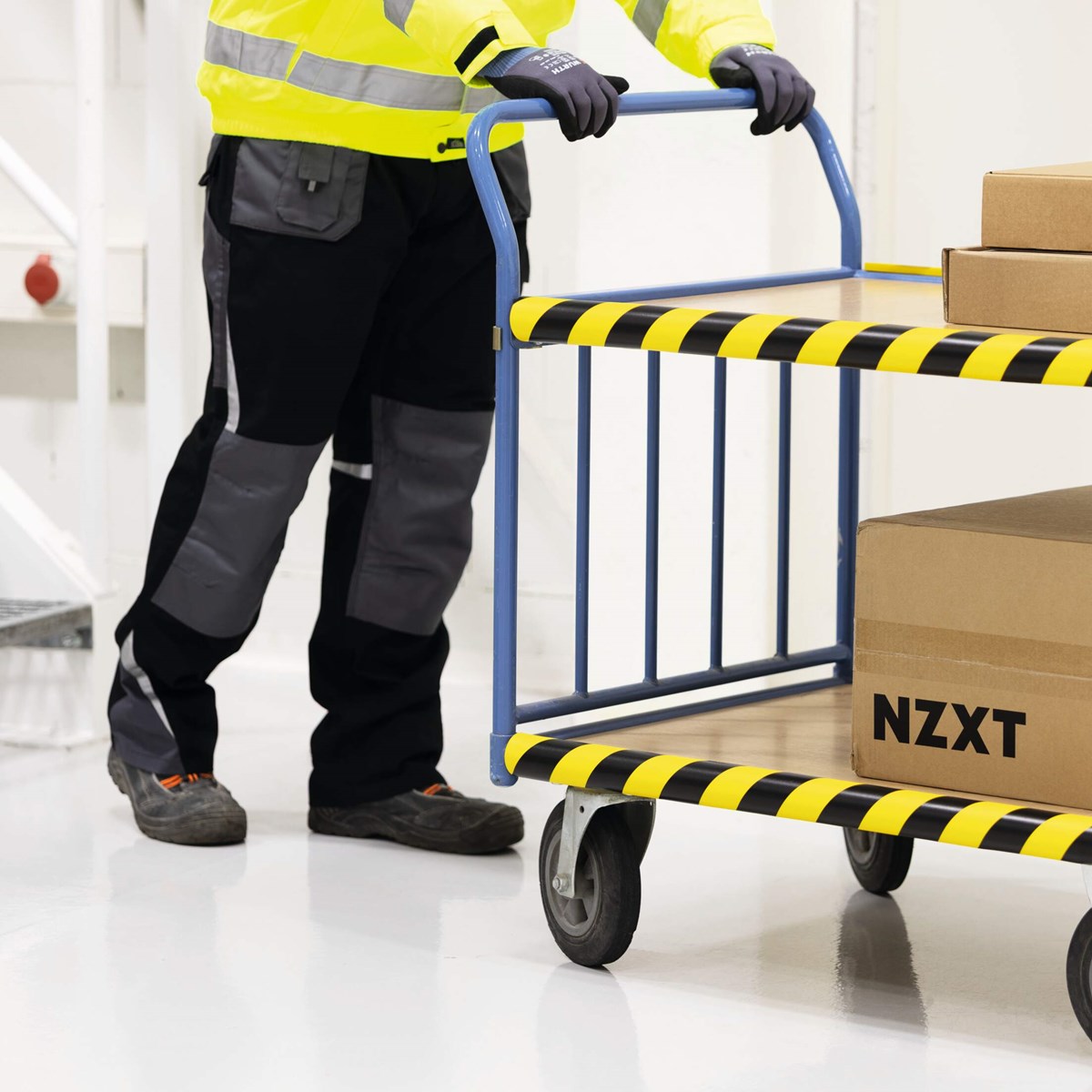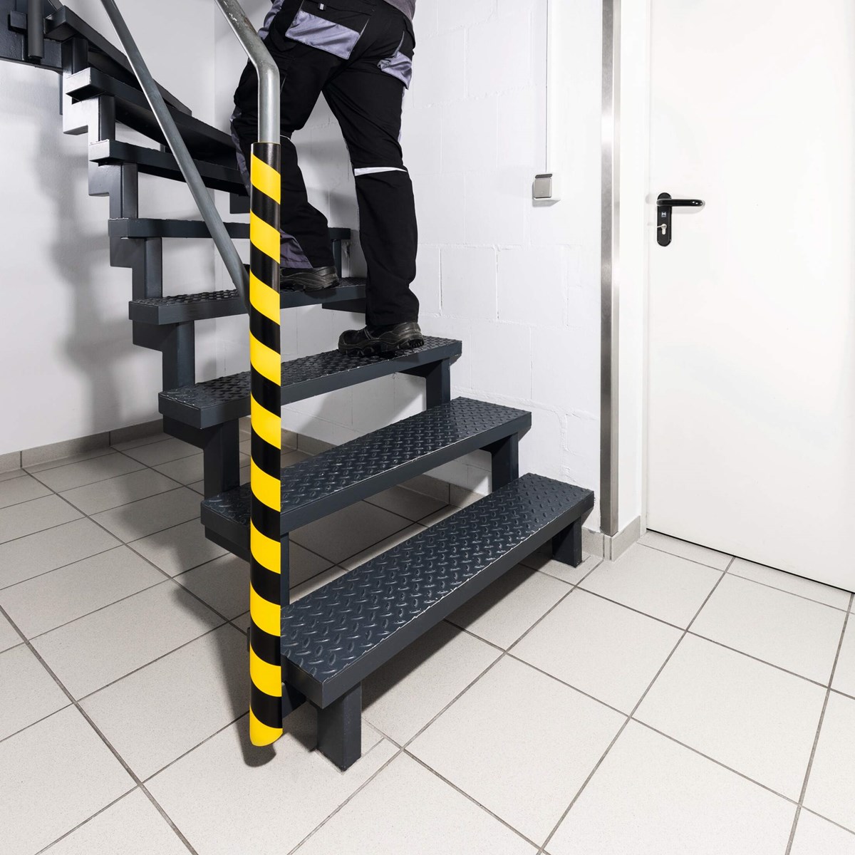 De svart/gula ränderna varnar för rör och stolpar och polyuretan skummet, som skyddsprofilen är tillverkad av, är stötdämpande. Det självhäftande rörskyddet skärs till önskad längd med en vass kniv. stark, självhäftande klisteryta av god kvalitet som bl.a. fäster på metall, trä, kartong och kakel med bäst resultat om temperaturen är 10-30°C. Färgnyanser enligt ASR A1.3 liknande RAL 1004/9003 (signal gul/signalsvart).
