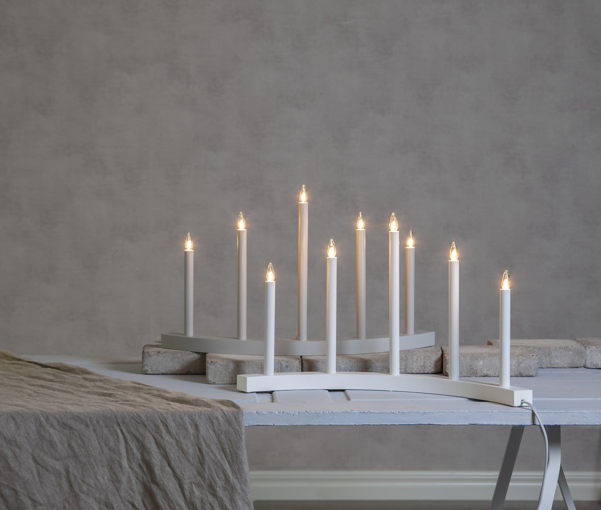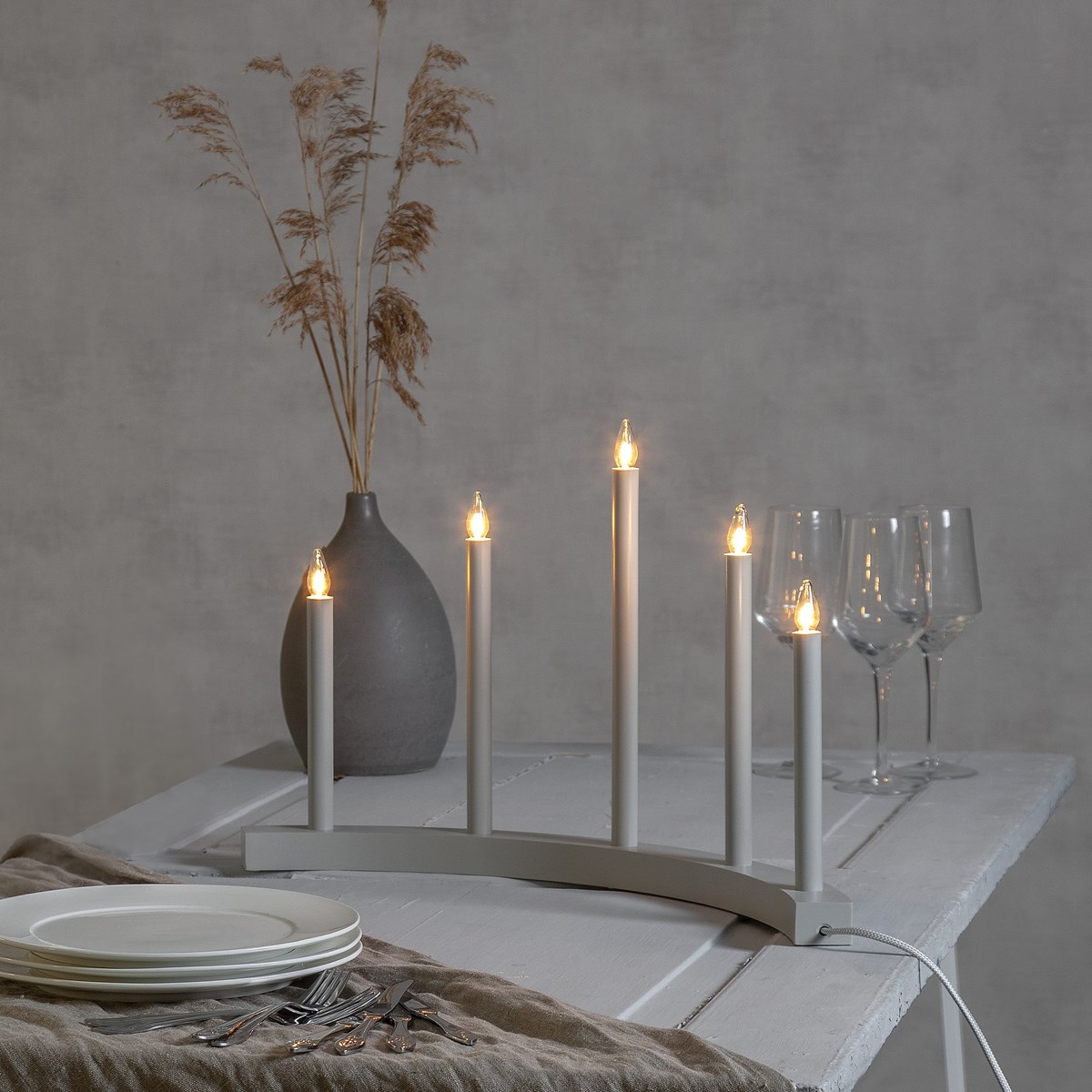 Stilren ljusstake där träbasen har en elegant böjd form. 5 ljuskällor med målade ljuspipor i metall. Bredd 60 cm x höjd 36 cm, djup 16 cm.
