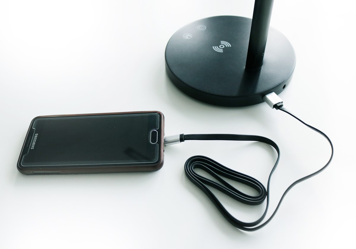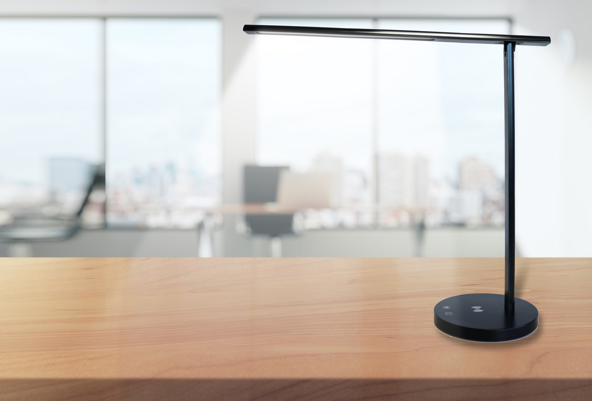 Skrivbordslampa med högeffektiv 7W LED-belysning. Touchströmbrytaren kan ställa in ljusintensiteten i fyra nivåer men även justera belysningsfärgen i tre nivåer för arbete, läsning eller vila. USB-port och trådlös induktionsladdare. Armlängd: 42 cm, lamphuvud: 41 cm. 2 års garanti.