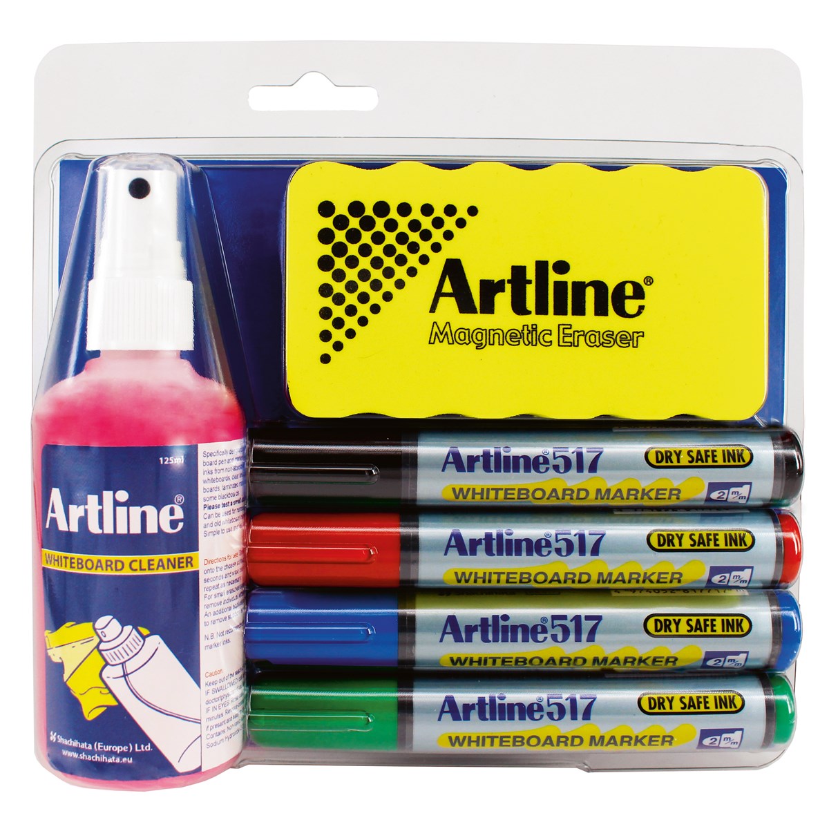 Komplett kit för effektiv daglig rengöring av din whiteboard. Innehåller fyra whiteboardpennor Artline 517 (svart, röd, blå och grön), magnetisk sudd och rengöringsvätska.