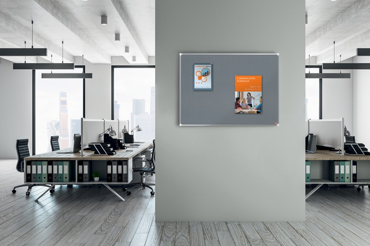 Modern anslagstavla med grå filtyta som fungerar med nålar eller kardborrband. Ytan färgar inte av sig och färgen står sig. Aluminiumram för hörnmontering. Mått 120x90 cm. Tavlan levereras med upphängningssats för väggmontering. 5 års garanti. Saknas din storlek? Frakt tillkommer, kontakta oss för prisuppgift.