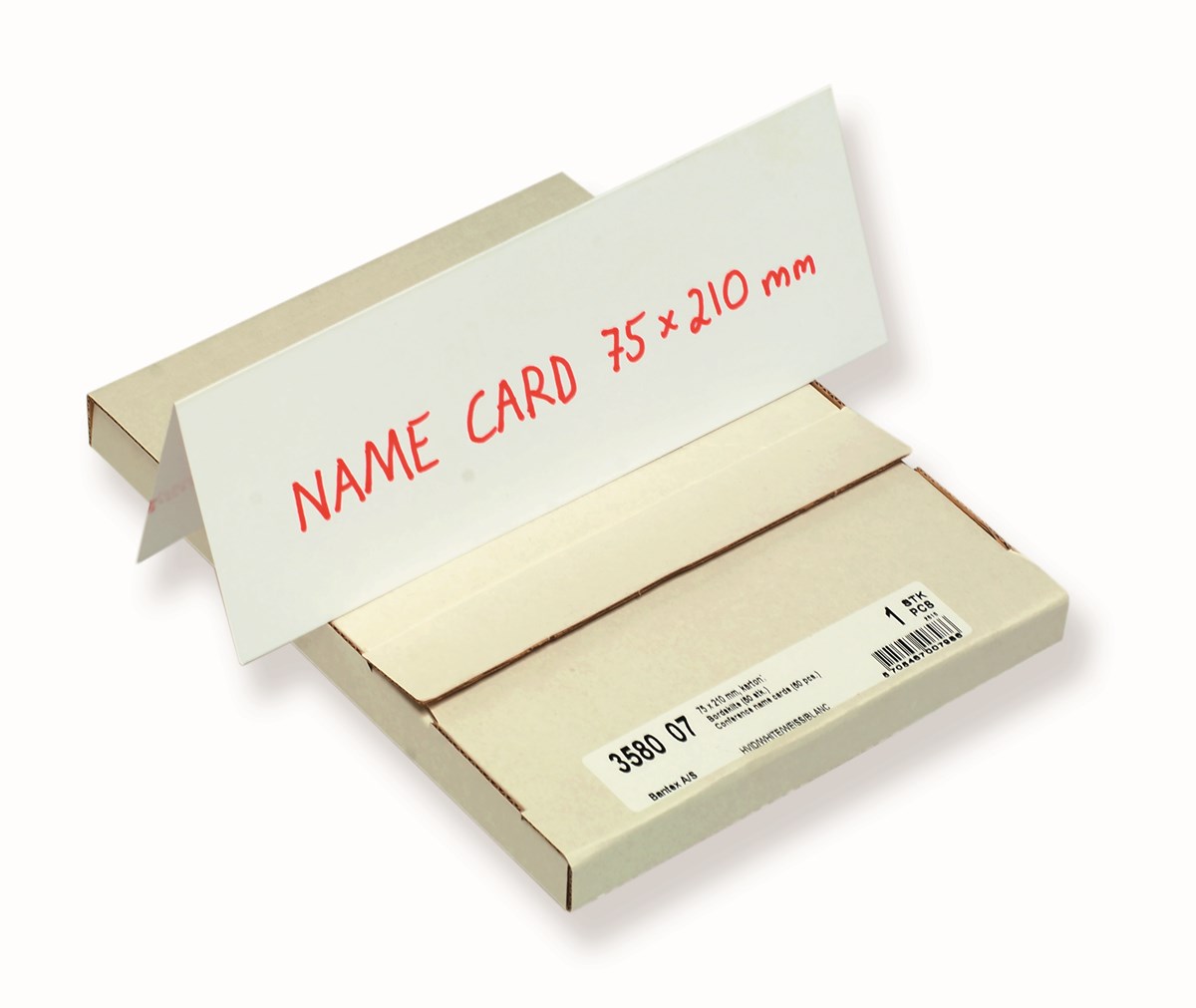 Bordsnamnskyltar av vit kartong. A5-falsade längs mitten.