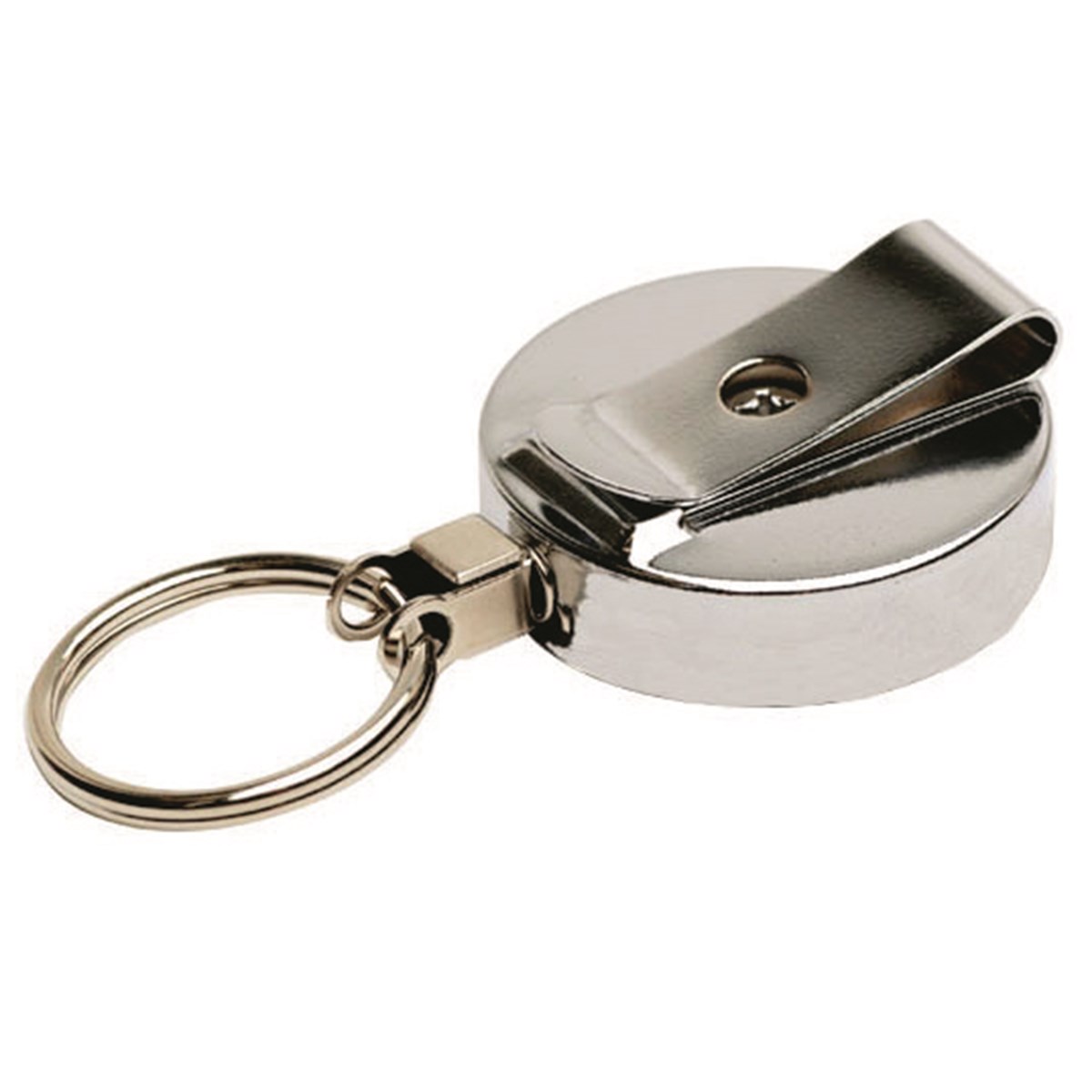 För kort och nycklar av olika format och tjocklekar. Ett eller flera kort och nycklar kan bäras i den förmonterade nyckelringen. Krokodilklämma kan användas för kort utan hål. Mycket enkel att hantera med en hand. Kraftigt bältesclip i metall på baksidan är standard. Trådlängd 85 cm.