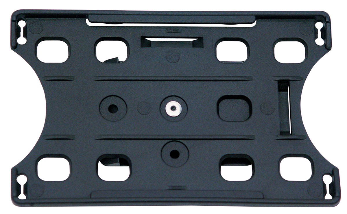Enkel hållare för standardkort (CR80) med vridbart clips i plast (tar kreditkortsformat 85,5x54 mm). Mått: 89x58 mm.
