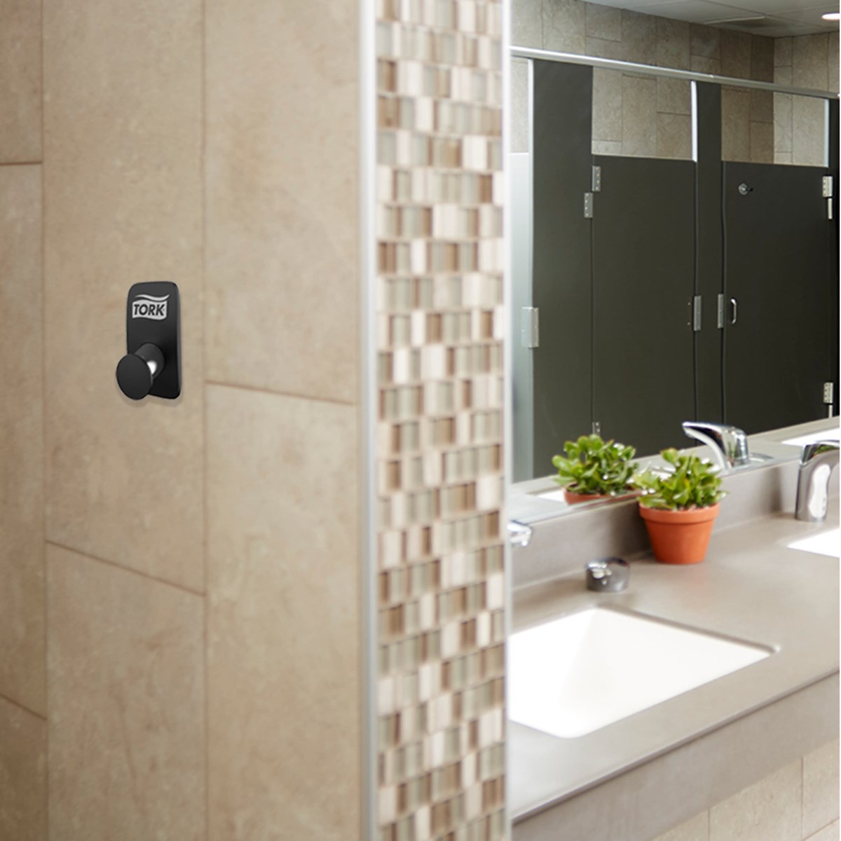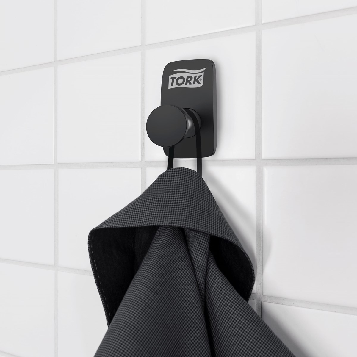 En stilren klädhängare i rostfritt stål och svart plast. Enkel att montera, inga synliga skruvar. Mått: 5,5x3x3,5 cm.