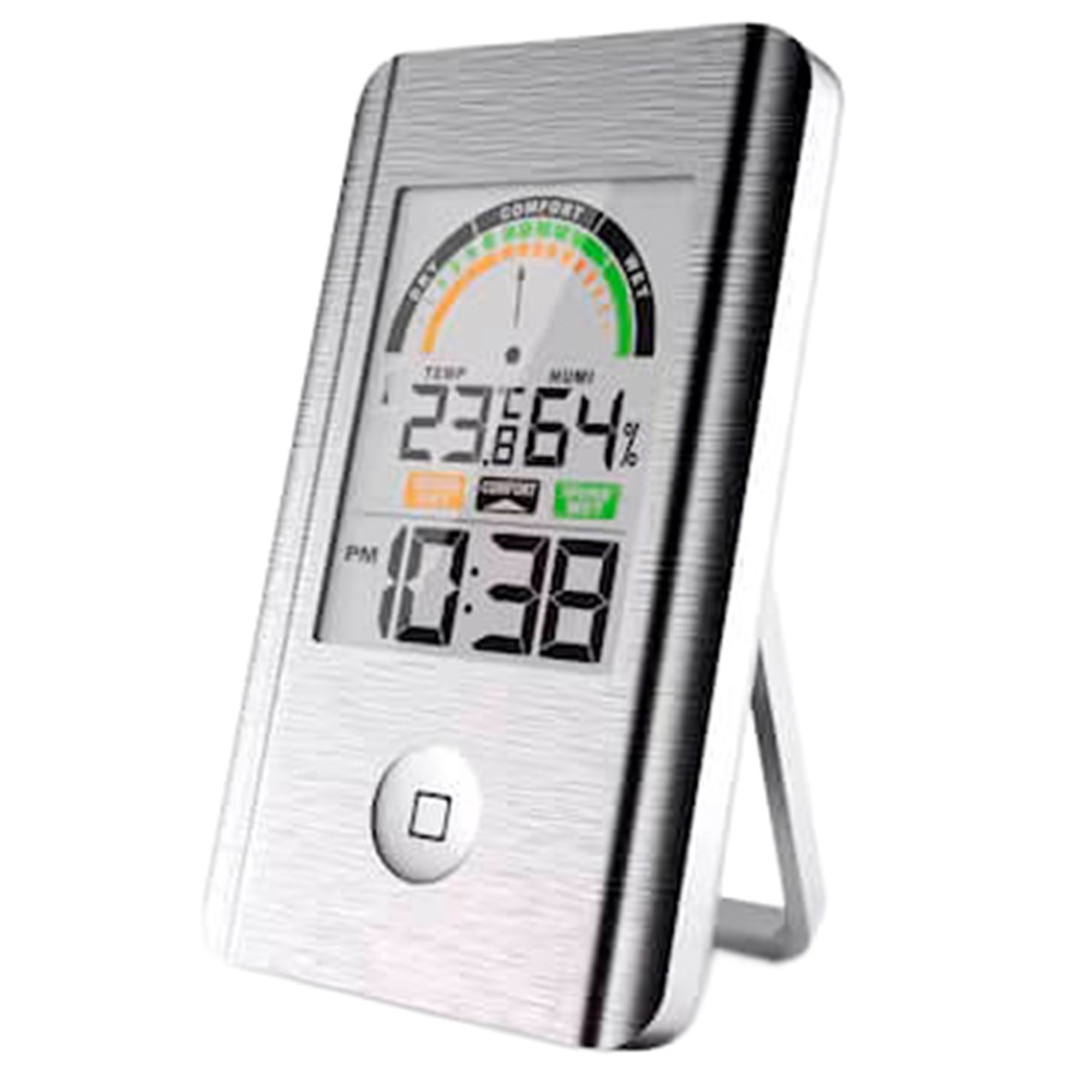 Digital termometer och hygrometer samt klocka för inomhusbruk. Metallfront av borstad aluminium. Kan hängas på väggen eller placeras med hjälp av det utfällbara bordsstativet. Visar temperatur, luftfuktighet, klocka samt indikator med komfortzoner i olika färger. Allt man behöver för ett trevligt inomhusklimat. Drivs med 2 st LR03/AAA-batterier (medföljer ej).