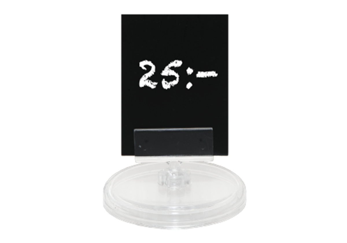 Menyhållare/skyltställ med rund fot samt skylthållare som är ställbar/vinklingsbar.