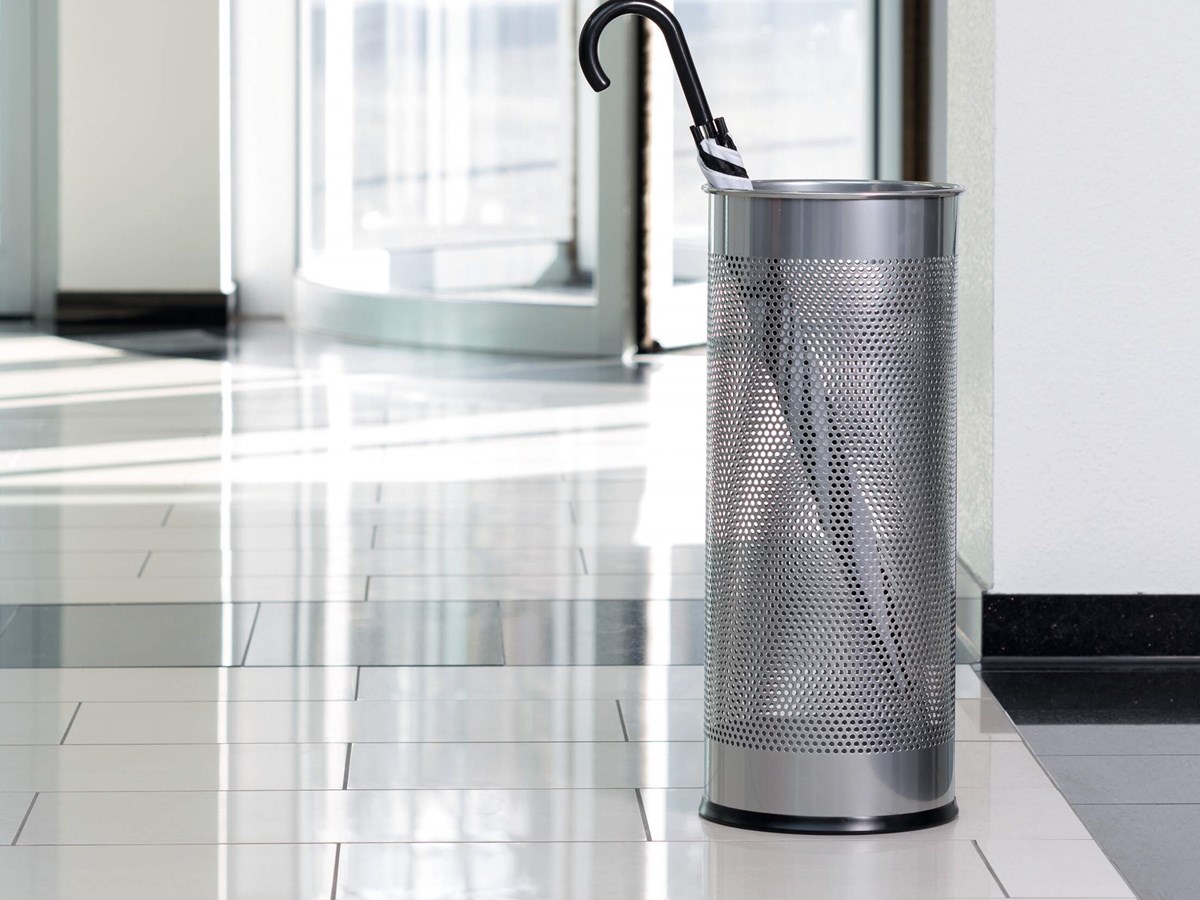 Runt paraplyställ i perforerad metall. Kan även användas som papperskorg. Antiglidskydd på undersidan som även skyddar golvet mot repor. Kapacitet: 28,5 liter. Höjd 62 cm, Ø 26 cm.