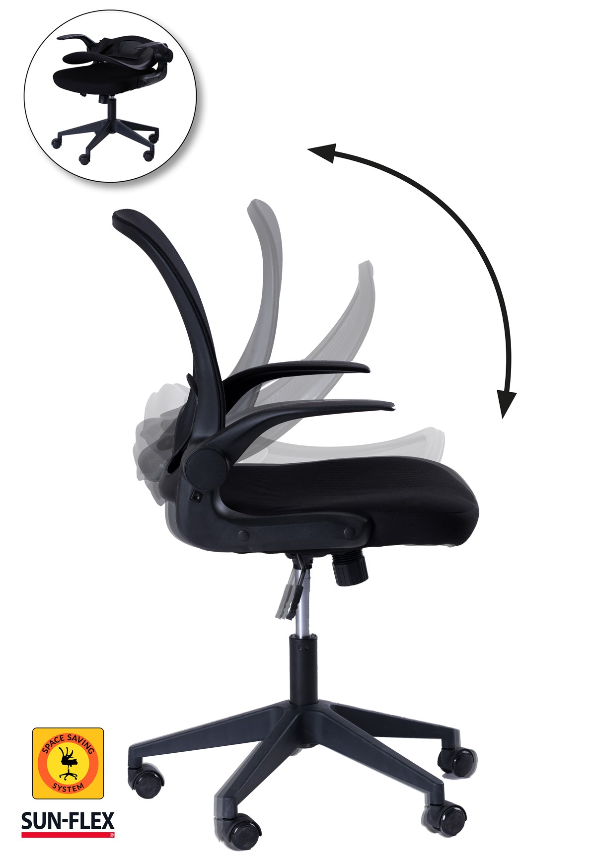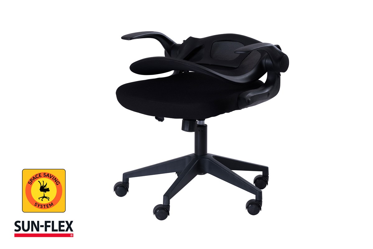 En kontorsstol som är utvecklad för dagens moderna flexibla arbetsplatser oavsett var du befinner dig, kontoret eller hemarbetsplatsen. Den är också ett ypperligt val vid aktivitetsbaserade arbetsplatser då den är enkel att förvara. Tack vare det utvecklade space saving system från SUN-FLEX®, med unika fällbara lösningar för både rygg och armstöd, ges möjlighet till extra yta då man inte sitter ner och arbetar. Förvaringen tar liten plats när stolen ej används då den enkelt fälls ihop och placeras under skrivbordet eller på annat lämpligt ställe. Stolen har svankstöd och ventilerande meshtyg i ryggen, synkronmekanism som ökar komforten, ger stöd i ryggen och en bekvämare sittställning. Stoppad sits med slitstarkt tyg och hjul som är avsedda för hårda och mjuka golv. Höjden av stolen är ställbar med en enkel handkontroll vid sidan, justerbart gungmotstånd och vinklingsbara armstöd.