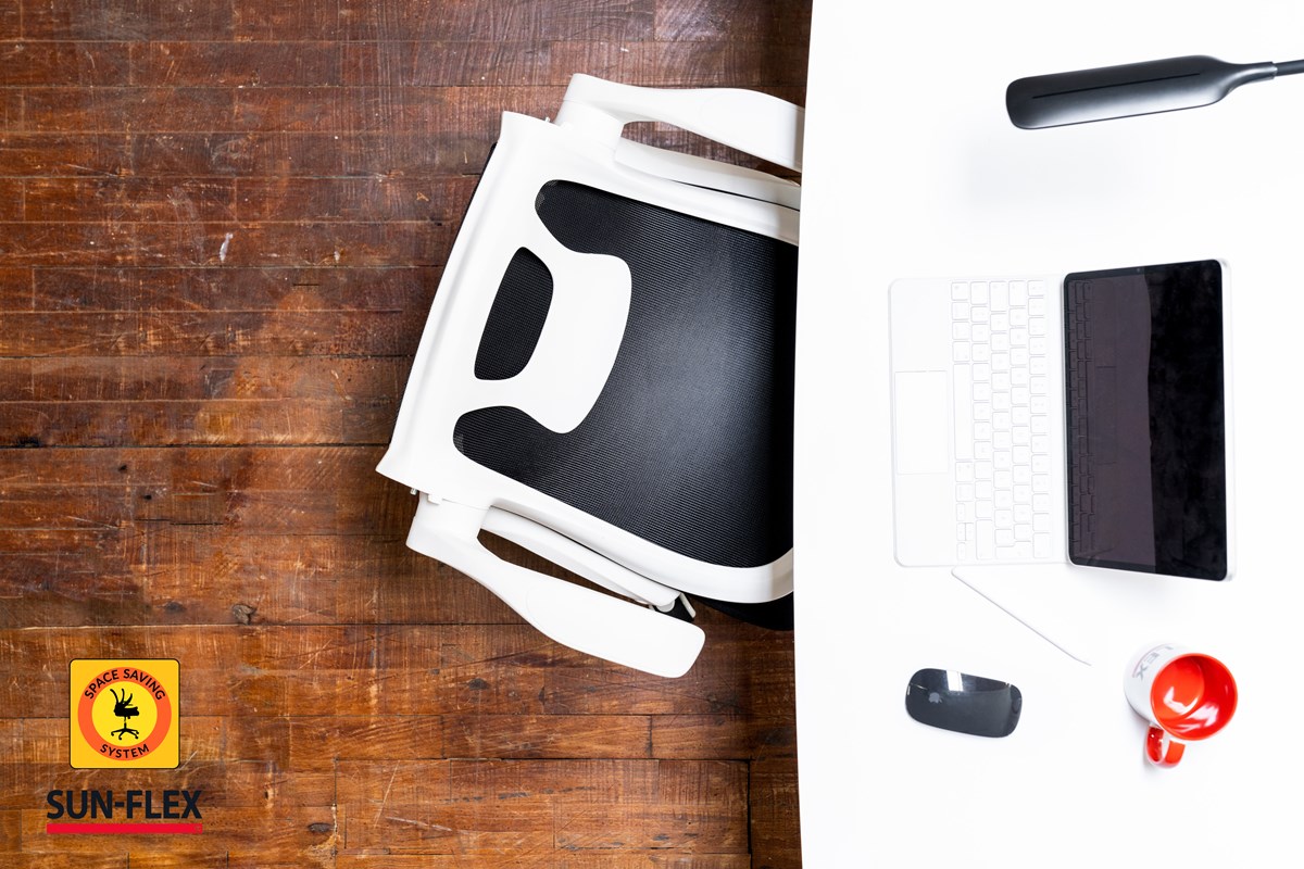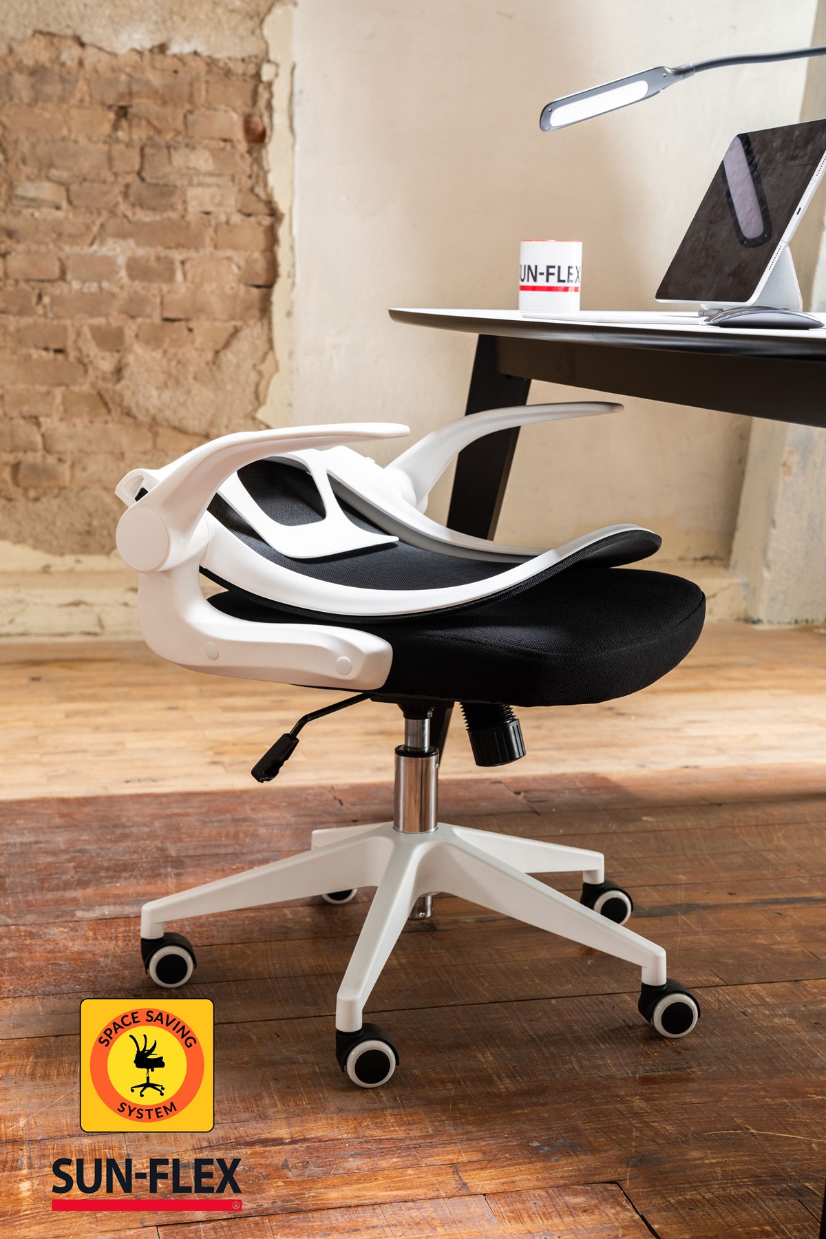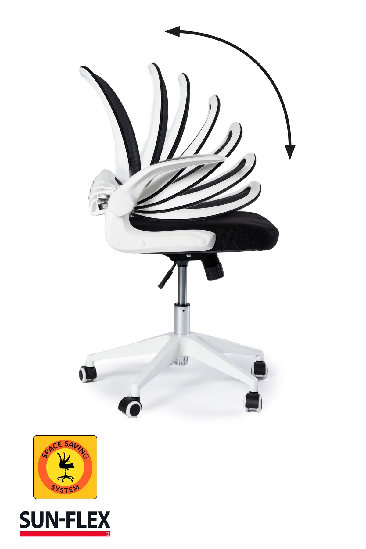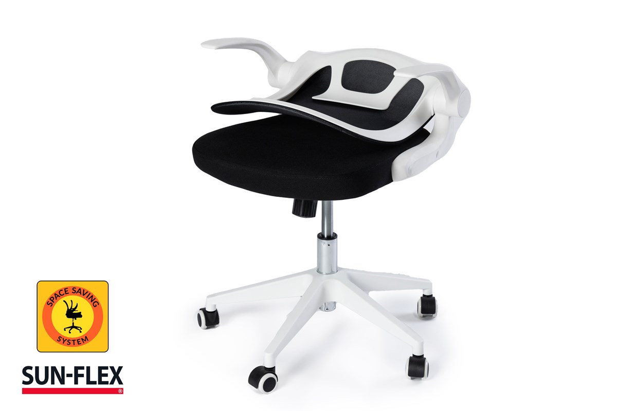 En kontorsstol som är utvecklad för dagens moderna flexibla arbetsplatser oavsett var du befinner dig, kontoret eller hemarbetsplatsen. Den är också ett ypperligt val vid aktivitetsbaserade arbetsplatser då den är enkel att förvara. Tack vare det utvecklade space saving system från SUN-FLEX®, med unika fällbara lösningar för både rygg och armstöd, ges möjlighet till extra yta då man inte sitter ner och arbetar. Förvaringen tar liten plats när stolen ej används då den enkelt fälls ihop och placeras under skrivbordet eller på annat lämpligt ställe. Stolen har svankstöd och ventilerande meshtyg i ryggen, synkronmekanism som ökar komforten, ger stöd i ryggen och en bekvämare sittställning. Stoppad sits med slitstarkt tyg och hjul som är avsedda för hårda och mjuka golv. Höjden av stolen är ställbar med en enkel handkontroll vid sidan, justerbart gungmotstånd och vinklingsbara armstöd.