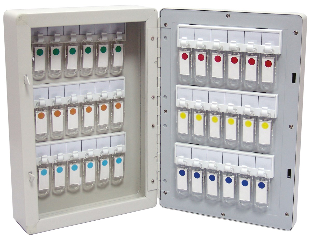 Skåp av kraftig stålplåt med digitalt lås och LED-indikator. Levereras med nyckelbrickor och 2 huvudnycklar. Justerbara krokar. Möjlighet till inmatning av egen kod. För drift av lås behövs 4 st AA-batterier (ingår ej).