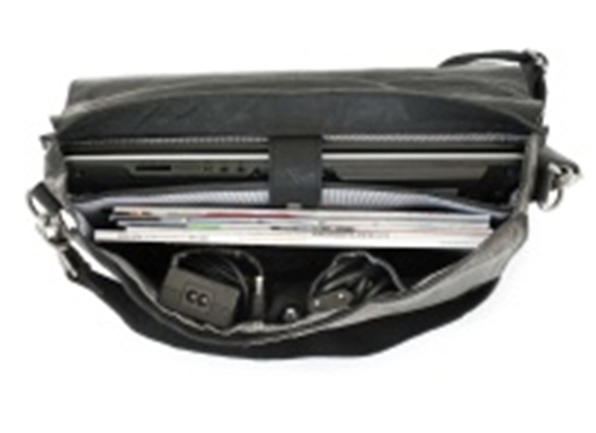 En stor portfölj i skinn som är inredd med tre stora fack. Mittenfacket har dragkedja, de två yttre är öppna. Mindre sidofack i de två öppna facken. Väskans framsida pryds av två öppna fack som döljs av flap-locket. Ett fack med dragkedja finns på utsidan baktill. Mått: 40 x 27 x 15 cm.