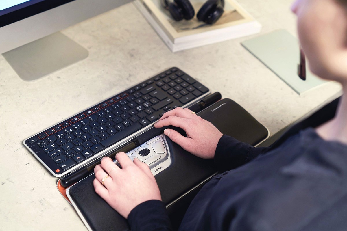 Det smala handledsstödet är perfekt för mindre händer och kompakta arbetsstationer. De inbyggda copy/paste-knapparna gör det enkelt att snabbt överföra text eller bilder mellan program och om du har andra genvägar som du ofta använder kan knapparna ställas in på dessa.
