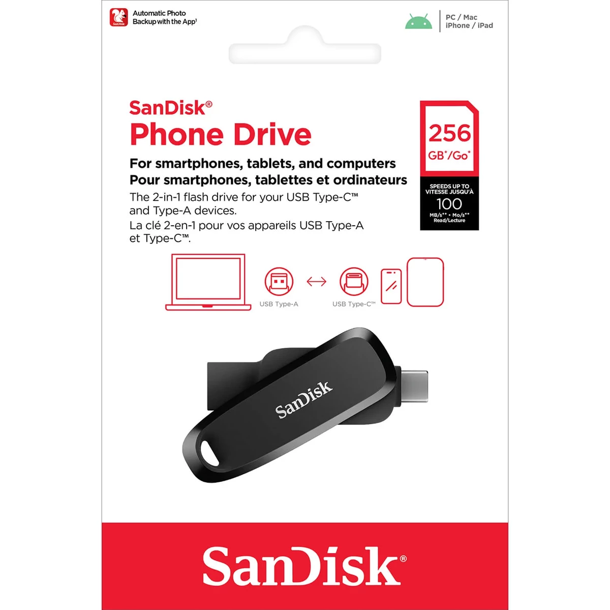 Kompatibel med USB Type-C och Type-A. Läshastigheter på upp till 100 MB/s med automatisk säkerhetskopiering med SanDisk-appen. Inkluderar programvaran RescuePRO Deluxe. Praktisk design med hål för nyckelring.
