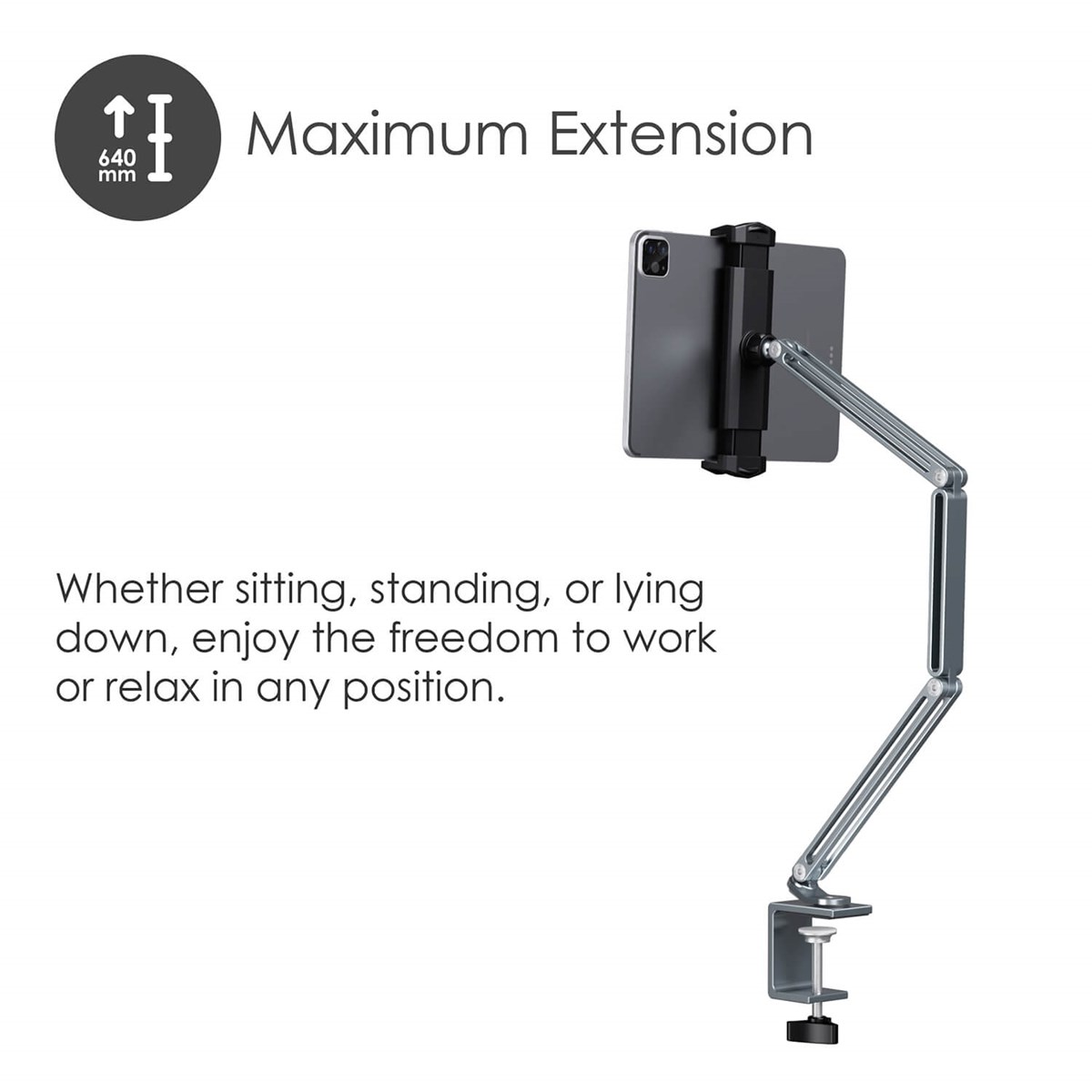 Revolutionera din tablet-upplevelse med Desire2 Flex Arm – ett ledat tabletfäste designat för flexibilitet och användarvänlighet. Tillverkat av anodiserad aluminium och med en robust klämma lämplig för skrivbord upp till 55 mm tjocka, erbjuder Flex Arm en mångsidig lösning för tablets upp till 12,9 tum i storlek. Med en maximal förlängning på 640 mm och flera vrid- och rotationsleder har du kraften att placera din tablet exakt där du vill ha den. Flex Arm är konstruerat för ultimat flexibilitet. Med fyra svängleder och en rotationsled i botten, tillsammans med en i toppen, har du fullständig kontroll över placeringen av din tablet. Oavsett om du arbetar, tittar på eller skapar, anpassar Flex Arm sig efter dina behov. Med de medföljande insexnycklarna kan du säkert låsa armen på plats, vilket ger en stabil plattform för din tablet. Flex Arm är tillverkat av anodiserad aluminium och säkerställer inte bara hållbarhet utan lägger också till en touch av sofistikering till din arbetsyta. Den robusta klämman fästs säkert på skrivbord upp till 55 mm tjocka, vilket ger en stabil och säker grund för din tablet. Designen på Flex Arm säkerställer att din tablet hålls säkert på plats, oavsett om den är i ett fast läge eller när du justerar.