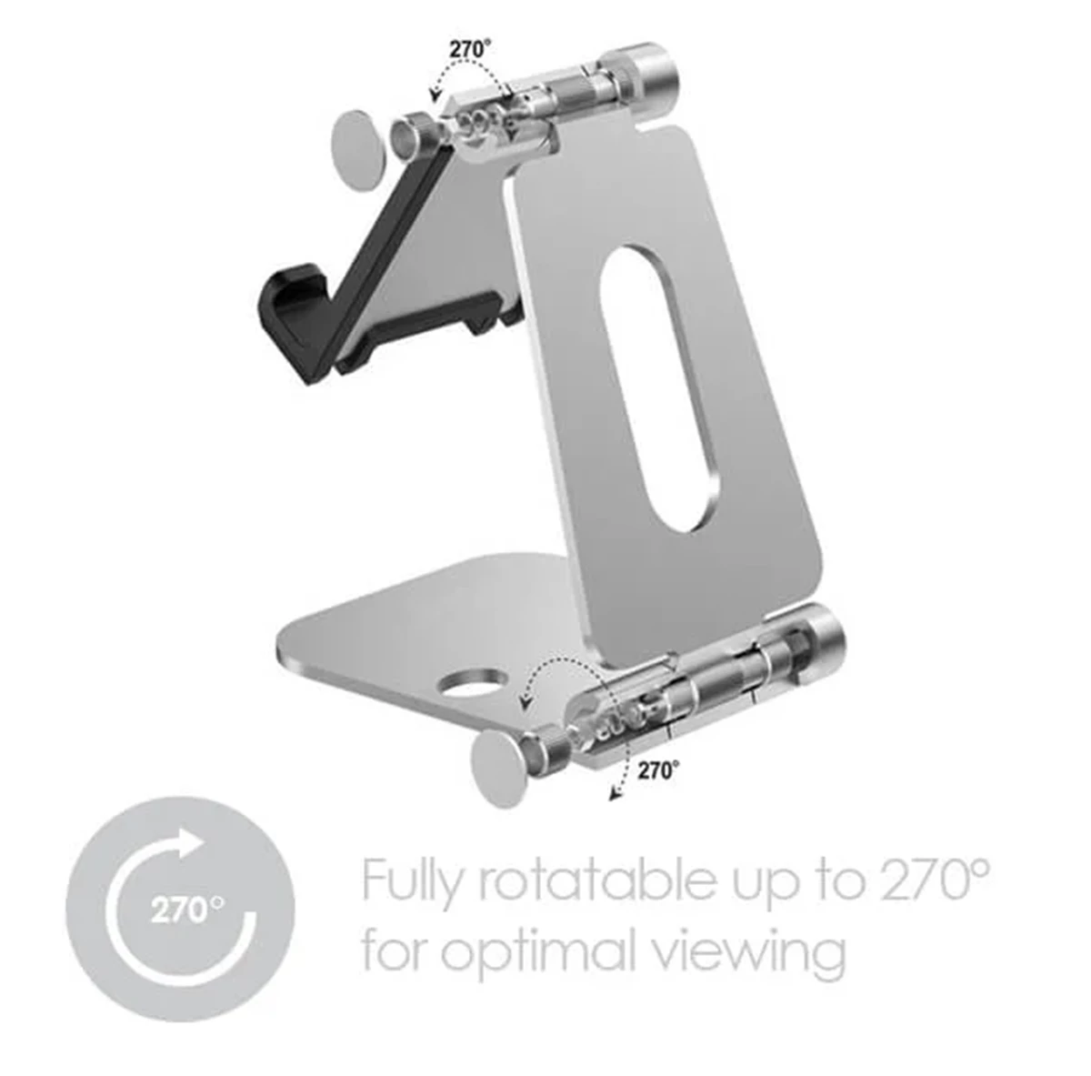 Desire2 View My Screen Anywhere skrivbordsställ för smartphones och surfplattor i slank, raffinerad aluminium - ett utmärkt val. I en bärbar, helt hopfällbar design med två roterbara gångjärn som möjliggör optimal visning med dina enheter, med enkel laddningsåtkomst och taktil silikon för säkert grepp om enheten.
