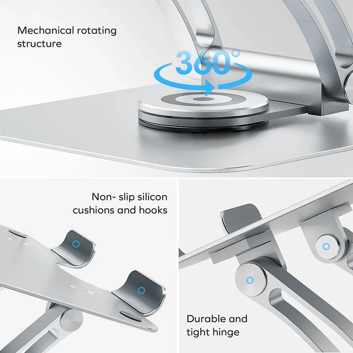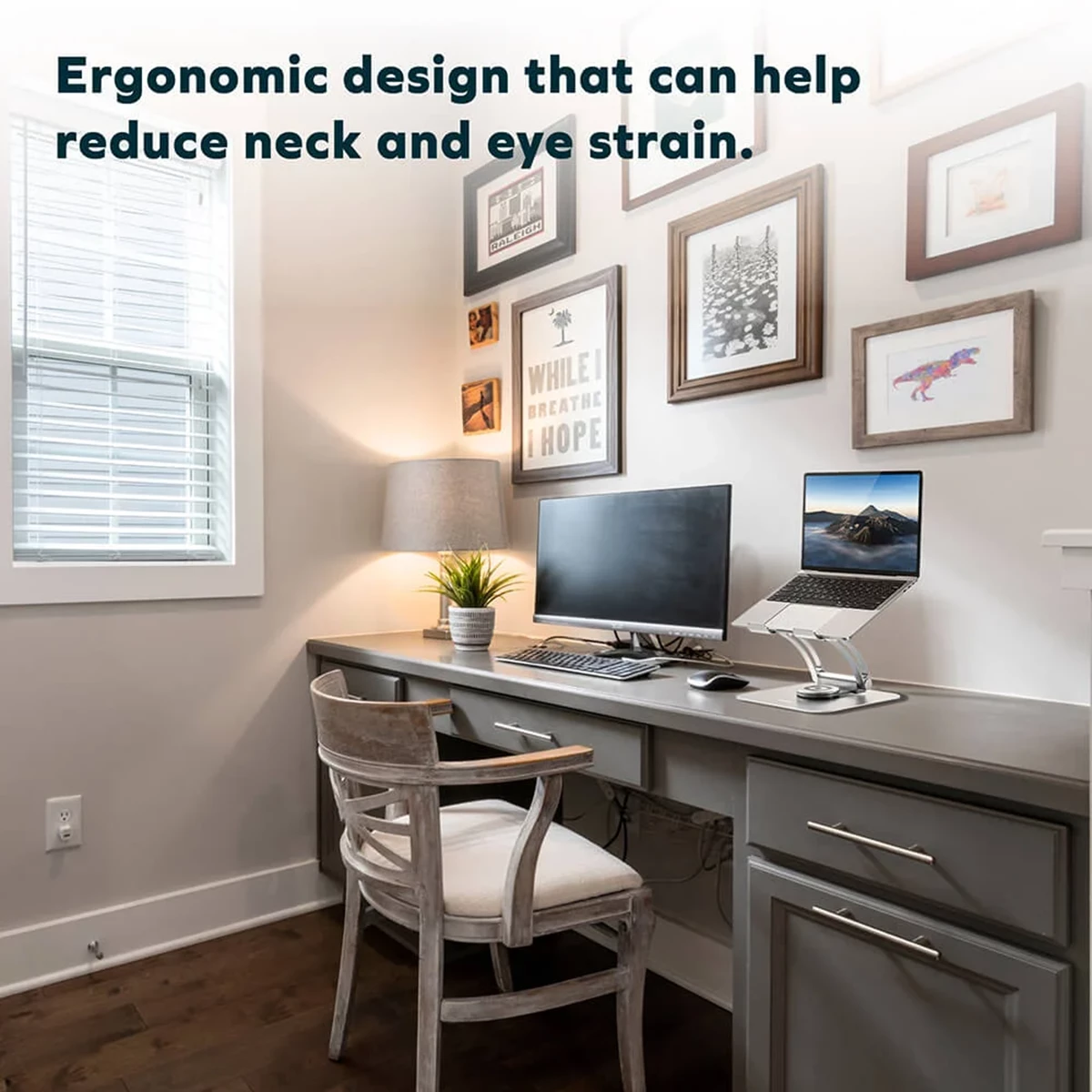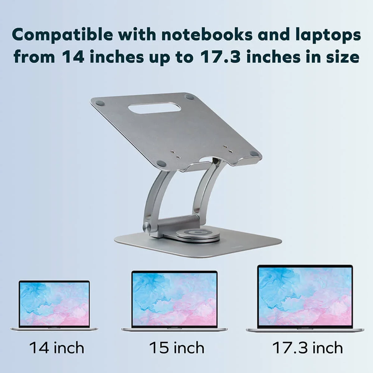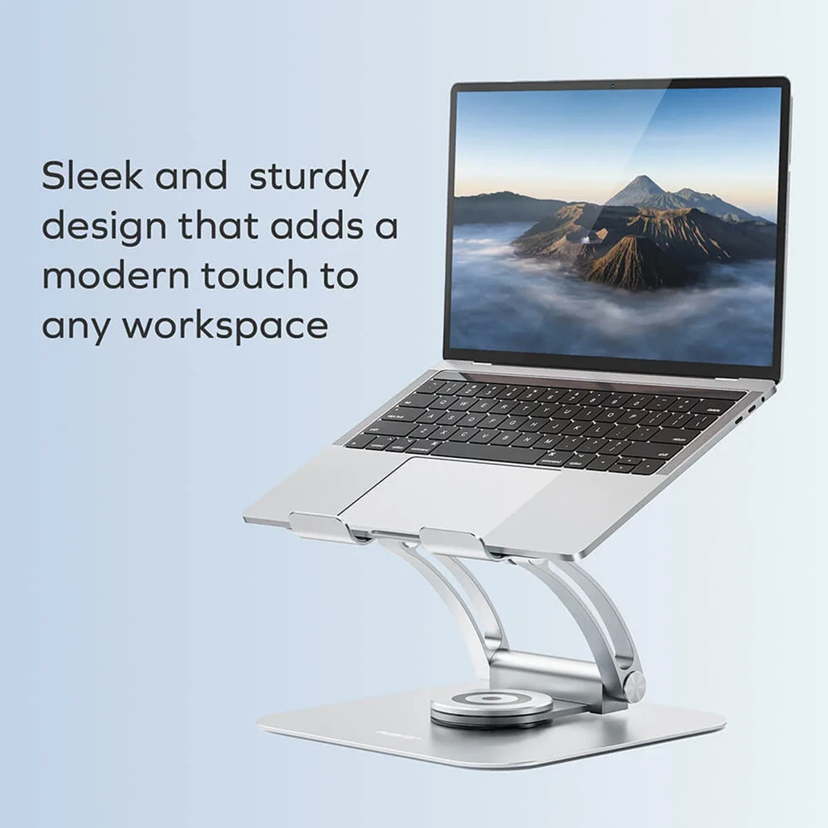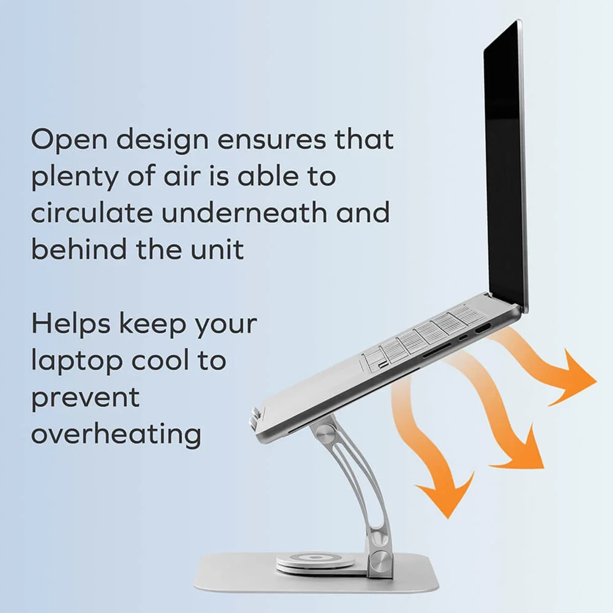 Detta ergonomiska stativ erbjuder justerbar höjd och 360 graders rotation för den ultimata arbetspositionen. Det är tillverkat av förstklassig aluminiumlegering och erbjuder hög styrka och låg vikt. Ändra snabbt höjden med snabbkopplingsmekanismen och njut av sömlös rotationsfrihet med klickstoppramen. Med sin raffinerade estetik är detta bärbara stativ ett praktiskt och elegant tillskott till alla arbetsplatser. Desire2 Supreme Dual Pivot 360 är mycket kompatibelt och kan stödja bärbara datorer från 10-17,3" i storlek. Det kan hålla upp till 6kg belasning och dess ökade höjd förbättrar kylning och luftflöde, vilket leder till optimal laptop-prestanda. Justera höjden från 0-30cm för att hitta den perfekta positionen. Detta bärbara stativ ger extra skydd för både dig och din enhet. Utrustat med silikongummikuddar håller det din bärbara dator säkert på plats utan att skada den. Den ergonomiska designen höjer den bärbara datorns skärm med upp till 30 cm, vilket främjar en bra hållning och minskar belastningen på nacke och ögon. Den förstklassiga aluminiumlegeringen erbjuder en minimalistisk och estetisk skrivbordsstruktur, särskilt när den är ihopkopplad med Apple-produkter som Mac, iMac och MacBook. Perfekt för hemmakontor, arbete och gaming.