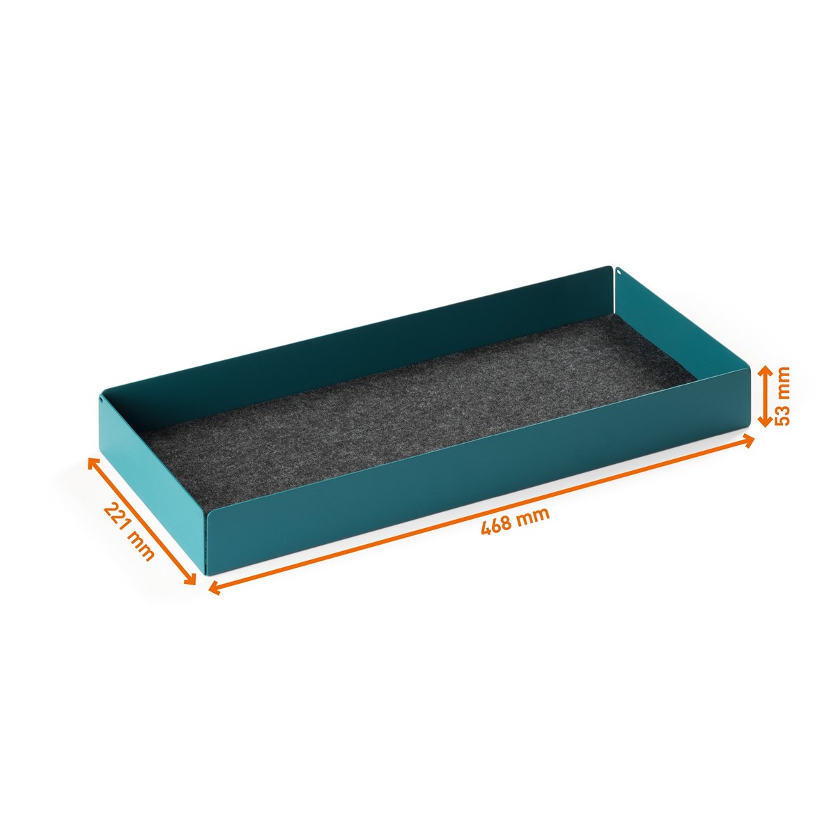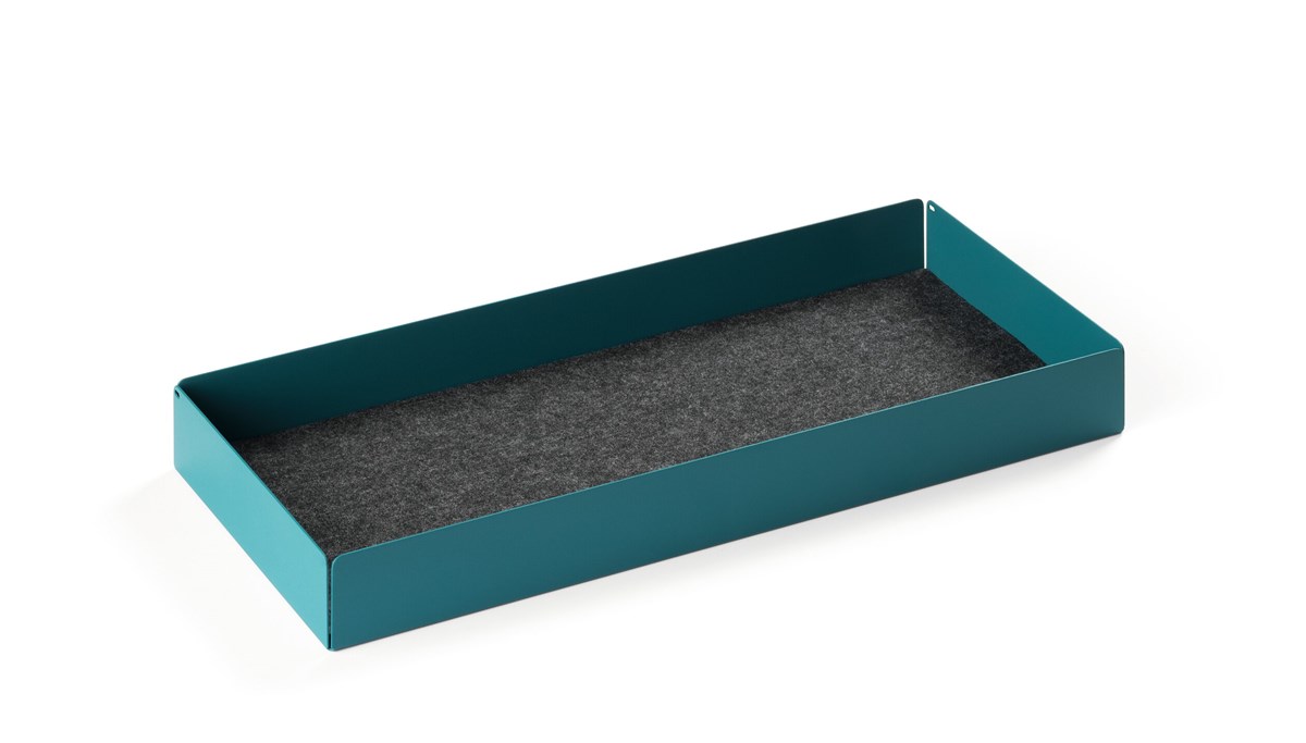 EFFECT-serien som denna låda ingår i, tillverkas av metall och har en mjuk, ljuddämpande och tålig bottenmatta av filt. Filten är tillverkad av PET-plast, varav 60% är av insamlad och återvunnen PET-plast (rPET). Material från lådans botten har använts till två glidskenor, som fästs i skärmstället. Hålen efter dessa skenor täcks av filtmattan. Produkterna i serien är 100 % återvinningsbara och förpackas hållbart med resursbesparande och plastfria material. Maxbelastning 5 kg. Mått: 46,8 x 5,3 x 22,1 cm (BxHxD).