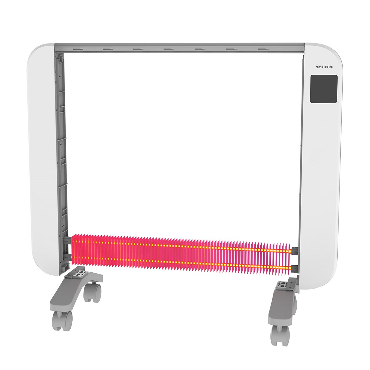 Radiatorn har en LCD-display med timer och inställningar för omgivningstemperatur, och har lägen som ECO, Comfort, Night och Anti-Frost. Inverterteknik (Triac) ger upp till 30% energibesparing, förbättrad termisk stabilitet och tyst drift. Den justerbara termostaten sträcker sig från 5 till 30°C och enheten har stöd för 24/7-programmering för ökad bekvämlighet.