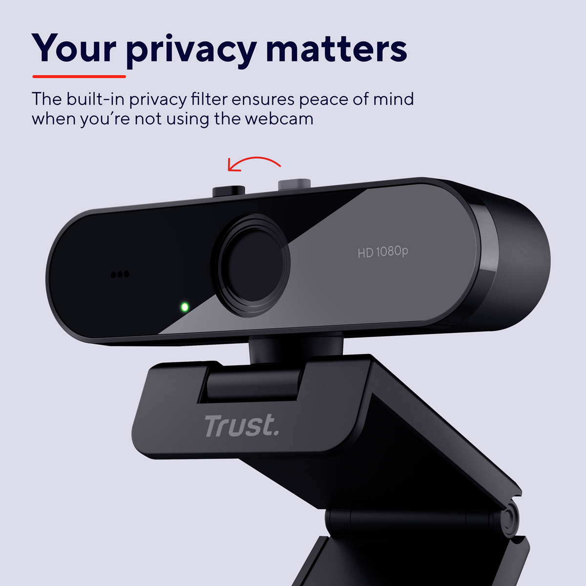 Webbkameran TW-200 är gjord av 85 % återvunnen plast. Det medföljande universalstativet är lämpligt för både monitorer och skrivbordsytor.