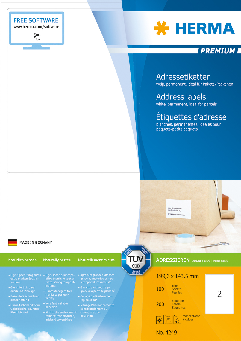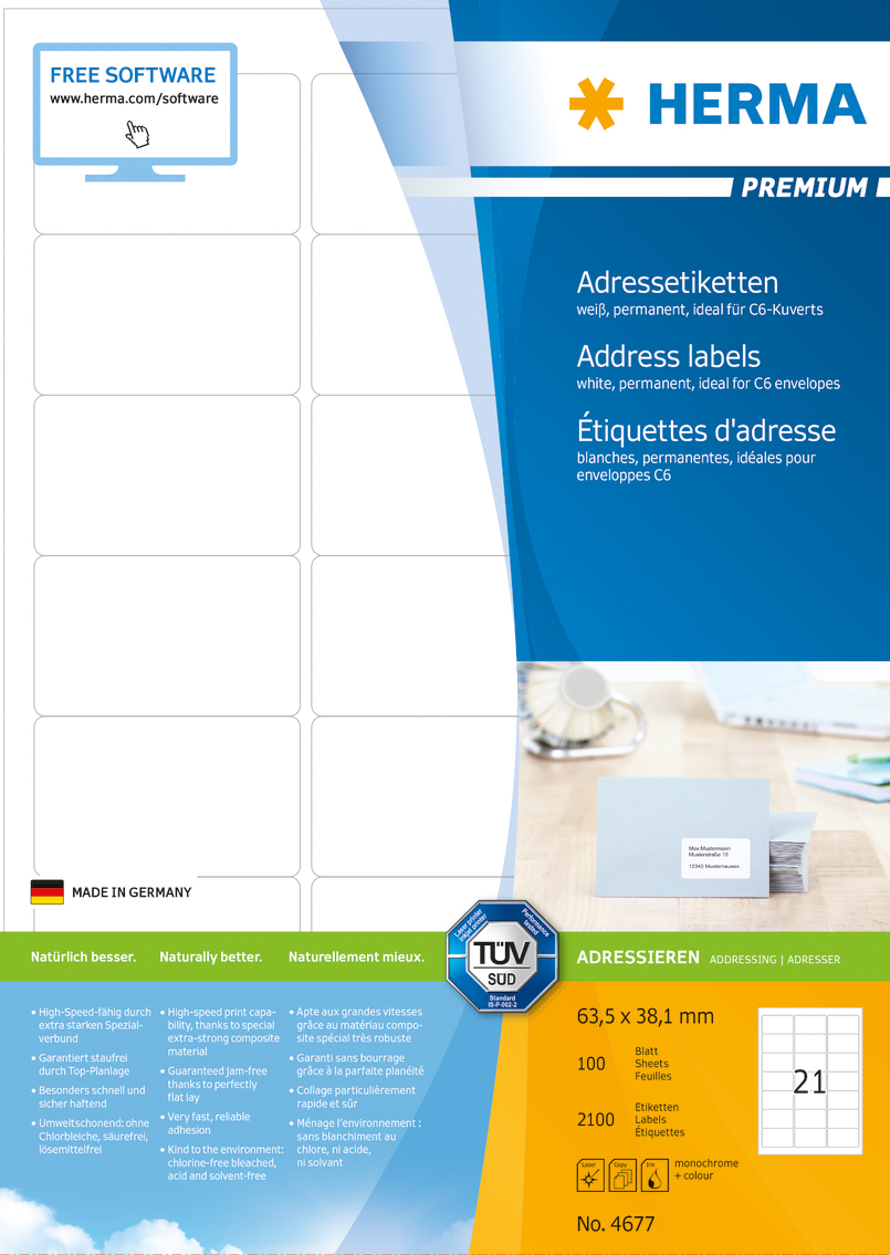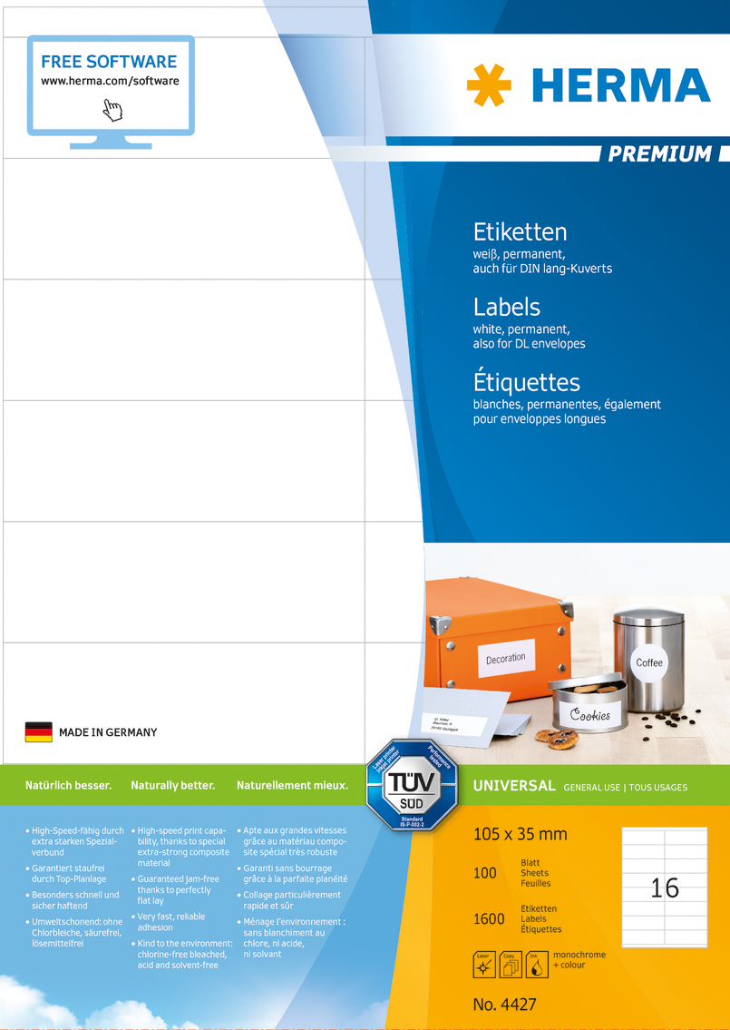 Problemfria utskrifter, testat och bekräftat av TÜV SÜD. Extra kraftiga etiketter – lätta att lossa och fästa. Fäster säkert även på kalla och fuktiga ytor. Hög vithetsgrad och jämn yta för bästa utskriftsresultat i svart och färg. Blekt utan klor, syrafritt och lim utan lösningsmedel. För laser, bläckstråle och kopiatorer. 100 A4-ark/förp.