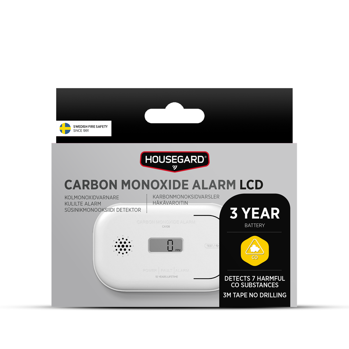 Godkänd för bostad, husbil, husvagn och båt Enkel montering med 3M-tejp Tydlig och lättläst display 48 timmars larmminne 5 års garanti