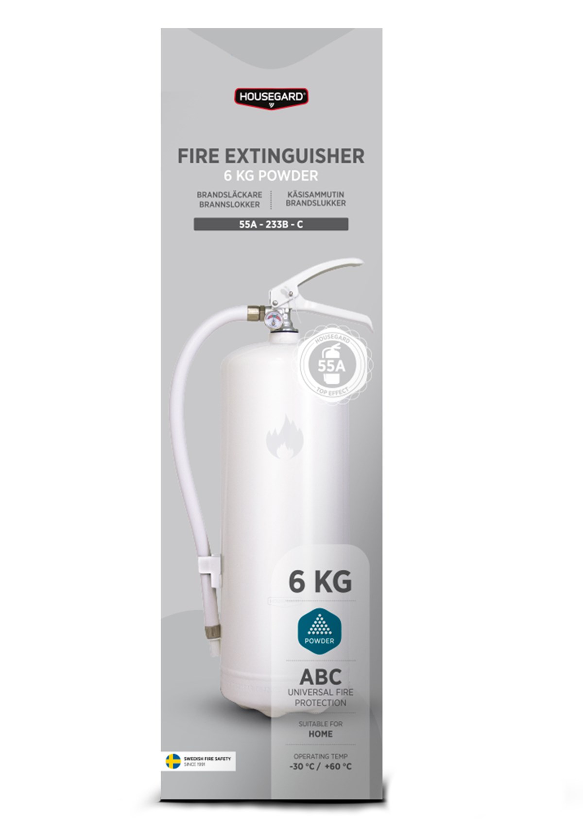 Design by Housegard-serien är avsedda för hemmamiljöer där användaren förväntas ha koll på var släckaren är placerad. Housegard 6 KG pulverbrandsläckare har effektivitetsklassen 55A 233B C, den högsta släckeffekten på marknaden.