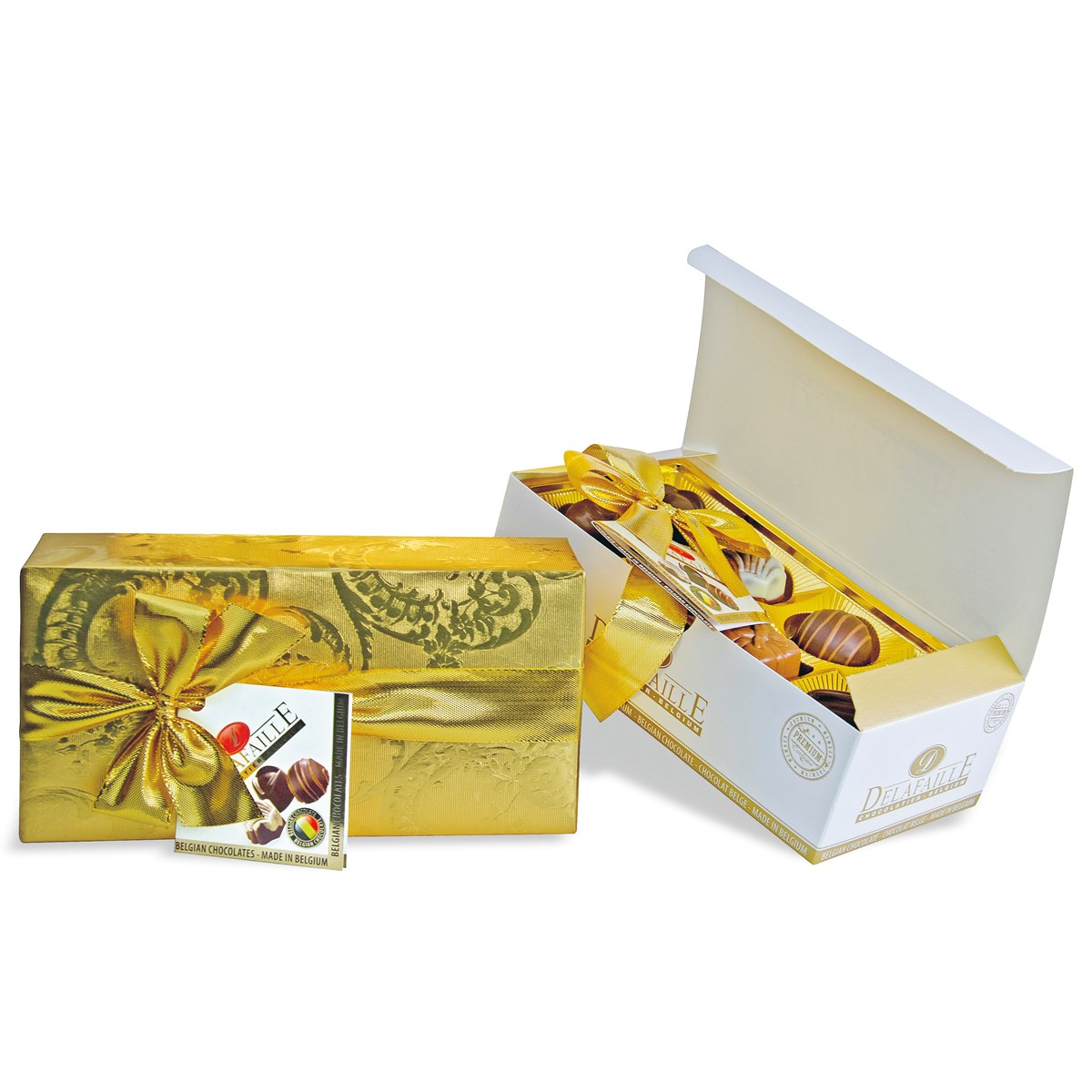 Belgisk choklad inslaget i fint guldpapper. Klappat och klart att ge bort. 200 g.
