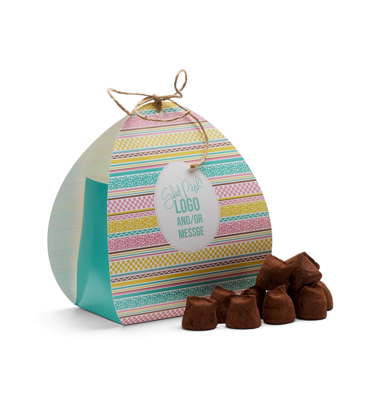 Vackert ägg i papper med randigt motiv och dekorativ rosett. Fylld med äkta svenska tryfflar med smak av havssalt.