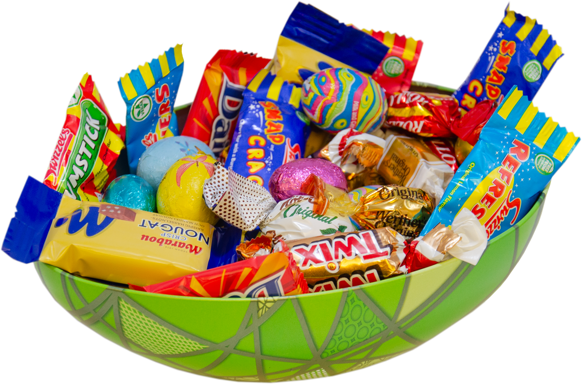 Stående och präglade ägg i vackra blandade färger fyllda med lösgodis. Mått: 14x19 cm.