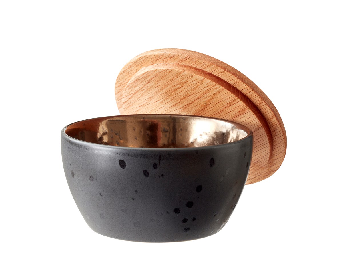 Skålar i stengods med mattglaserad utsida och vacker, blank bronsglasyr på insidan. Lock av ek. 3 skålar i storlekarna 10, 12 och 14 centimeter.