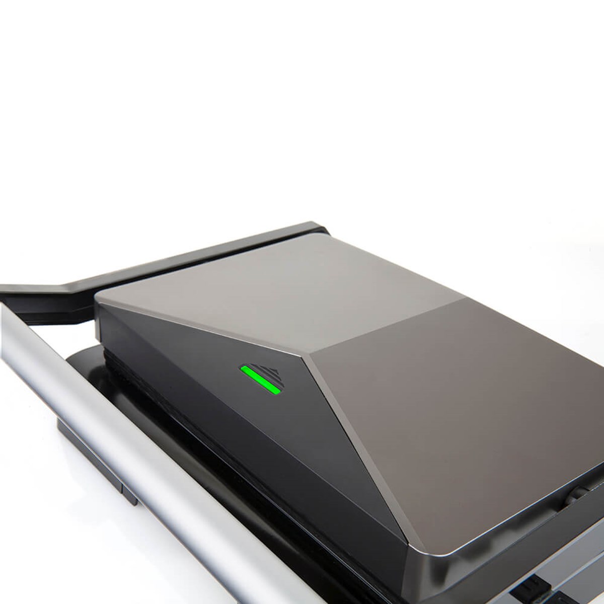 Grillens design är elegant och modern och passar in i alla kök med sina mörka stålfinish. Ljusindikatorn på ovansidan av grillen indikerar när grillen är klar att tillaga och dess svala handtag ger en säker hantering av apparaten medan den är varm.