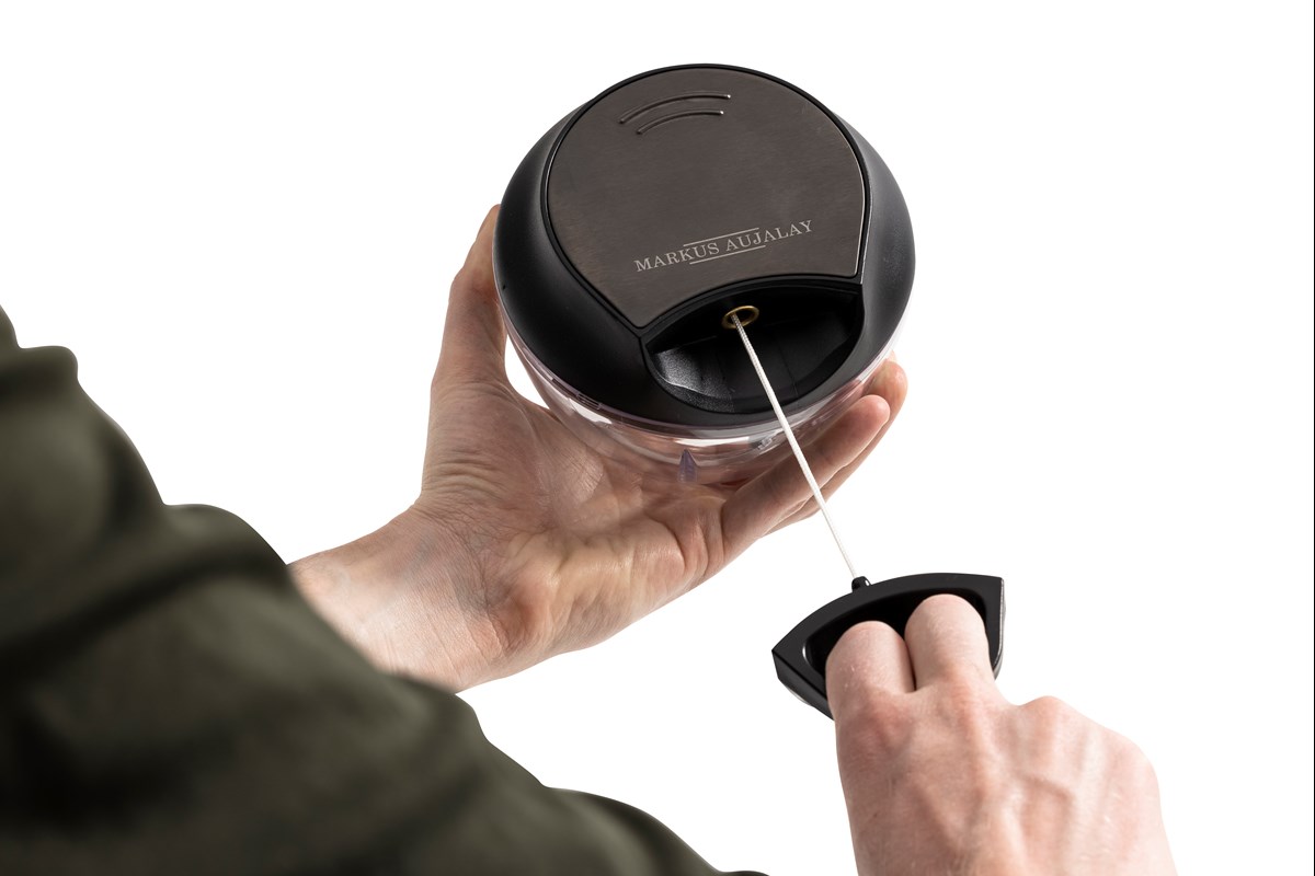 roterar när du drar i handtaget och efter några drag är det klart. Storlek ca 13 x 10 cm. Levereras i färgkartong.