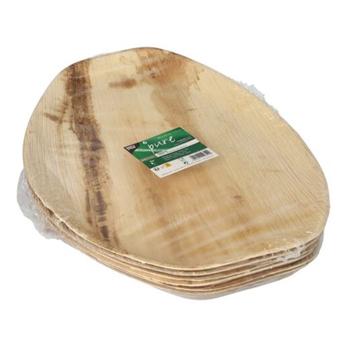 Den ovala serveringsbrickan är tillverkad av hållbart palmblad och mäter 43 x 29 cm med en höjd på 3 cm. Dess naturliga design ger en rustik och elegant känsla, perfekt för att servera mat på fester eller evenemang. Palmbladsbrickan är både komposterbar och biologiskt nedbrytbar, vilket gör den till ett miljövänligt alternativ för engångsbruk.