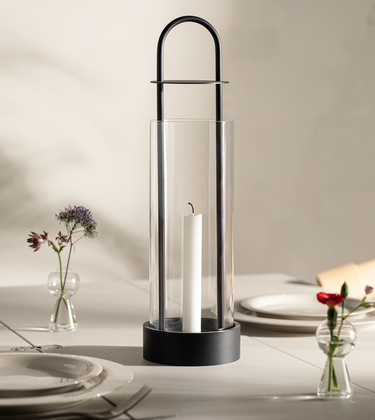 Kristina Starks lykta kan användas året om. Det värmebeständiga glaset skyddar lågan och tillför en extra säkerhet inomhus på vintern och mot kvällsbrisen på sommaren. Passar både med kron- och stearin- eller blockljus. Mått: Ø120, höjd 440 mm.