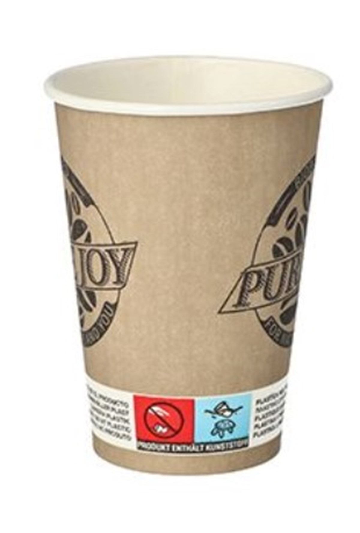 To Go-bägare Pure Joy tillverkad av papper med PLA-beläggning för varma drycker av alla slag. Tål upp till 90 °C. Ej lämplig för alkoholhaltiga drycker. Biologiskt nedbrytbar. Komposterbar enligt DIN EN 13432.