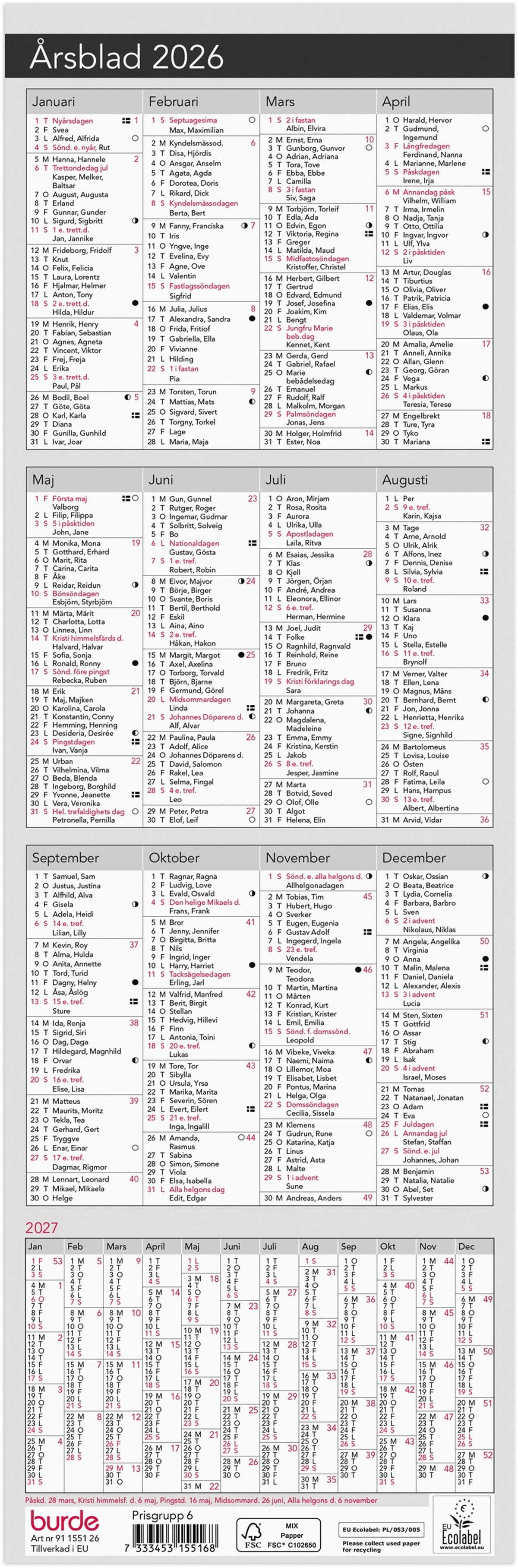 Format: 120x366 mm. Layout: År/blad. Kalendarium: 2026-01-01 - 2026-12-31. Innehåll: Kyrkliga helgdagar, Flaggdagar, Helgdagar, Månfaser, Namnsdagar, Årsöversikter föregående, innevarande och de tre följande åren. Antal sidor: 2. Miljöinformation: FSC®. Ecolabel.