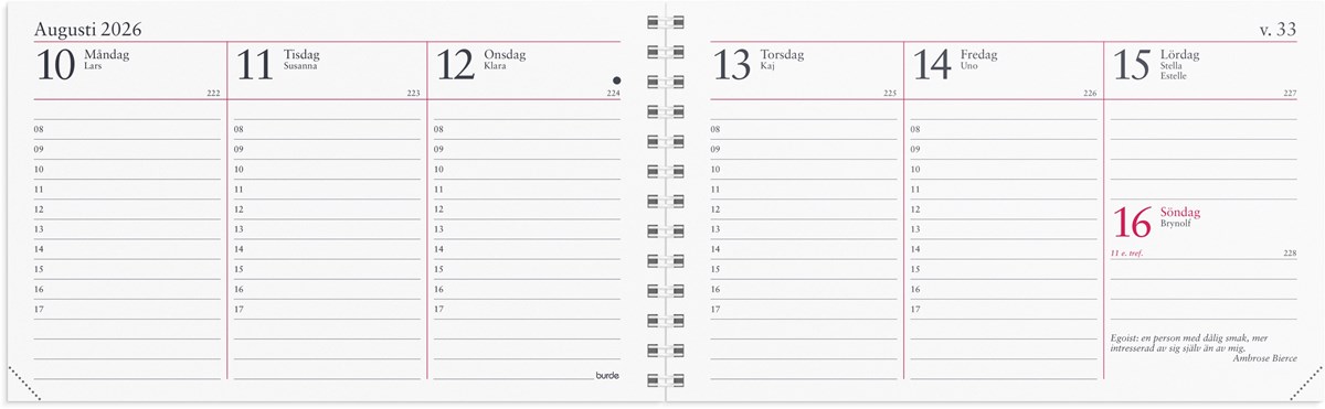 Format: 148x90 mm. Layout: Stående. Vecka/uppslag. Timindelning 8-17. Kalendarium: 2025-12-15 - 2027-01-03. Omslag: Kartong. Spiralbunden. Innehåll: Kyrkliga helgdagar, Flaggdagar, Helgdagar/aftnar, Månfaser, Namnsdagar, Internationella helgdagar översikt, Temadagar/händelser, Årsöversikt/årsöversikter, Årsplan/årsplaner. Antal sidor: 128. Miljöinformation: FSC®.