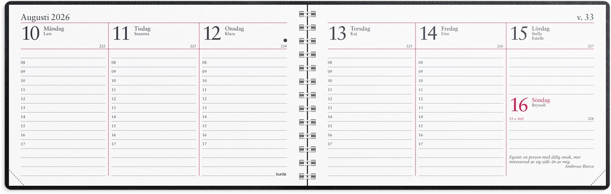 Format: 148x90 mm. Layout: Stående. Vecka/uppslag. Timindelning 8-17. Kalendarium: 2025-12-15 - 2027-01-03. Omslag: Konstläder. Spiralbunden. Innehåll: Kyrkliga helgdagar, Flaggdagar, Helgdagar/aftnar, Månfaser, Namnsdagar, Internationella helgdagar översikt, Löst telefonregister, Temadagar/händelser, Årsöversikt/årsöversikter, Årsplan/årsplaner. Antal sidor: 128. Miljöinformation: FSC®.