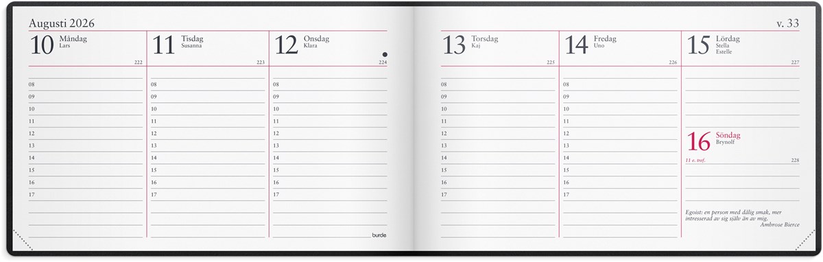 Format: 148x90 mm. Layout: Stående. Vecka/uppslag. Timindelning 8-17. Kalendarium: 2025-12-15 - 2027-01-03. Omslag: Plast. Inbunden. Innehåll: Inbundet telefonregister, Kyrkliga helgdagar, Flaggdagar, Helgdagar/aftnar, Månfaser, Namnsdagar, Internationella helgdagar översikt, Temadagar/händelser, Årsöversikt/årsöversikter, Årsplan/årsplaner. Antal sidor: 144. Miljöinformation: FSC®. Klimatkompenserad.