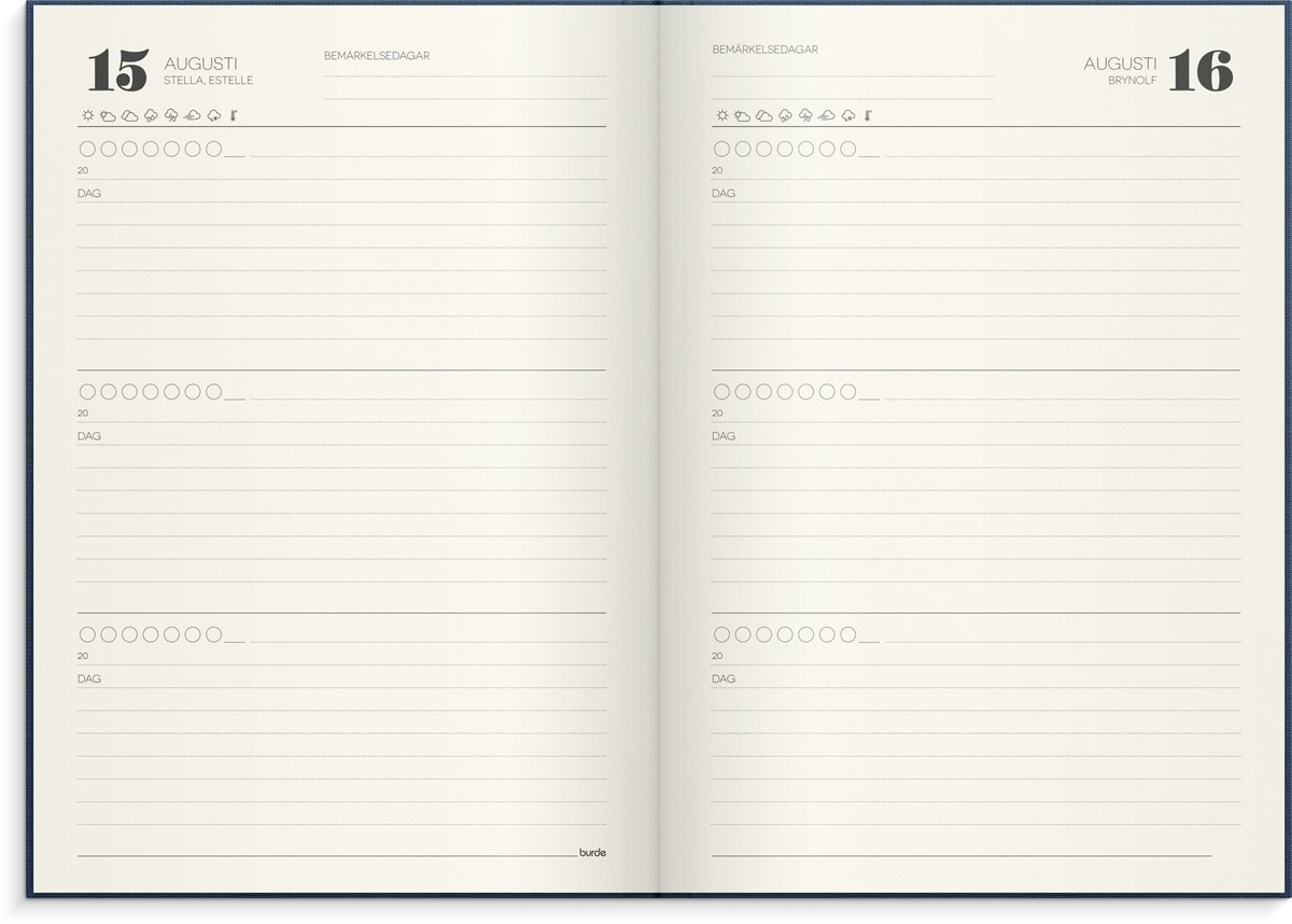 Format: 142x205 mm. Layout: Dag/sida. Omslag: Linnetextil. Inbunden. Detaljer: Märkband. Innehåll: Årsplan, namnsdagsregister. Antal sidor: 384. Pappersvikt: 100 g. Miljöinformation: FSC-papper. Varumärke: Burde.