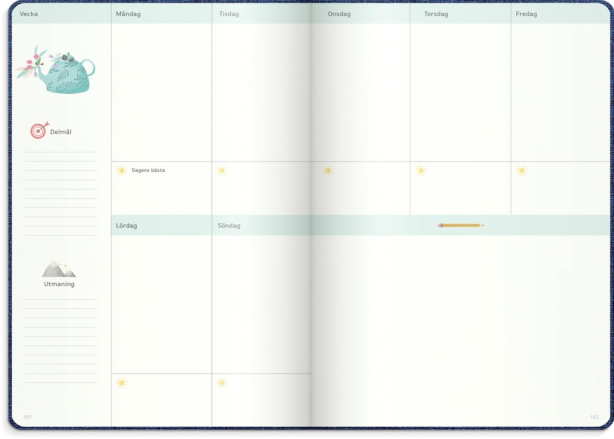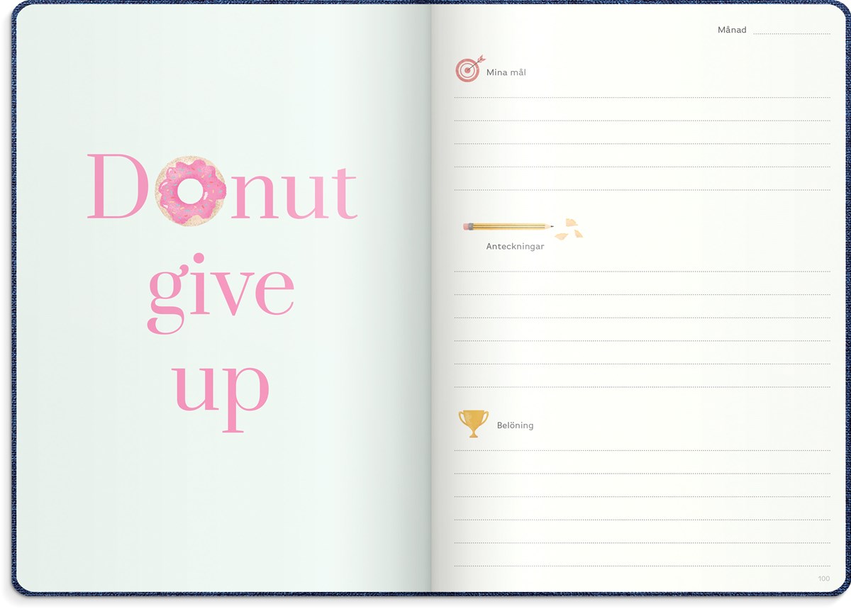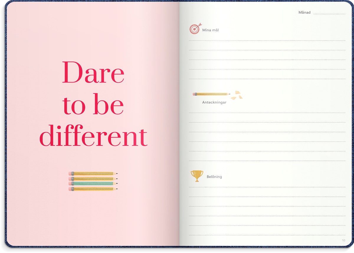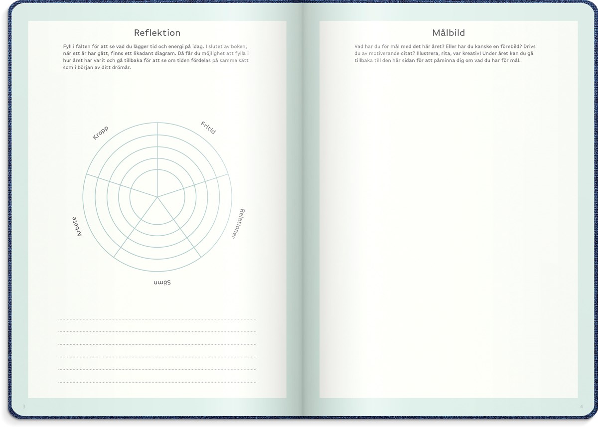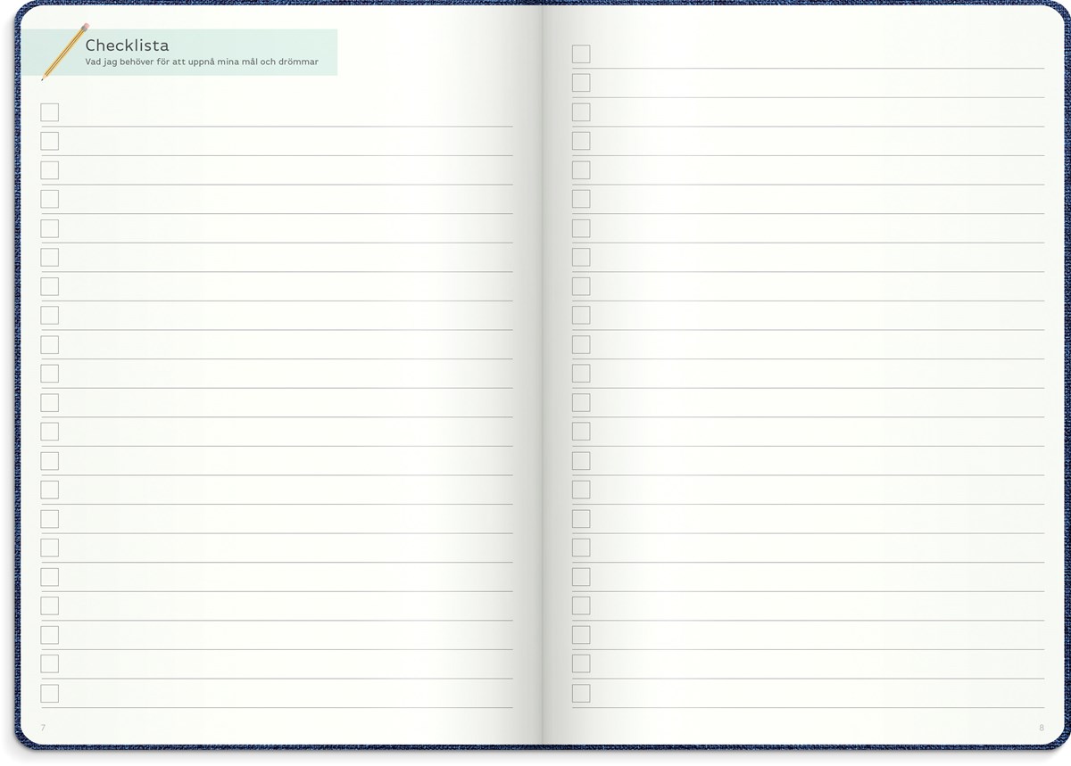 Inbunden odaterad kalender med två märkband. Omslag i blått konstläder och silverprägling. Ett planeringsverktyg för att uppnå sina drömmar och mål. Kalendern innehåller sidor med plats för mål, reflektioner, moodboards, checklistor, bucket lists, födelsedagar och anteckningar. Kalendern är uppbyggd för olika mål: årsmål, halvårsmål, samt delmål månads- och veckovis. Skriv ner månadens prestationer, utmaningar och förbättringar. Kalendern innehåller även prickade sidor för att locka fram användarens mest kreativa sidor. 100 g cremefärgat papper, 128 blad (256 sidor). FSC®-papper. Format: 165x233 mm.