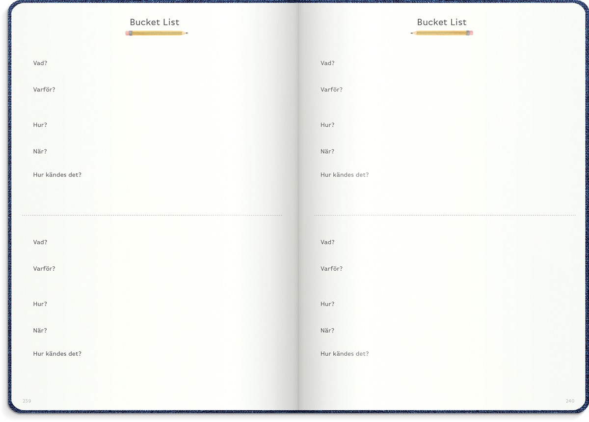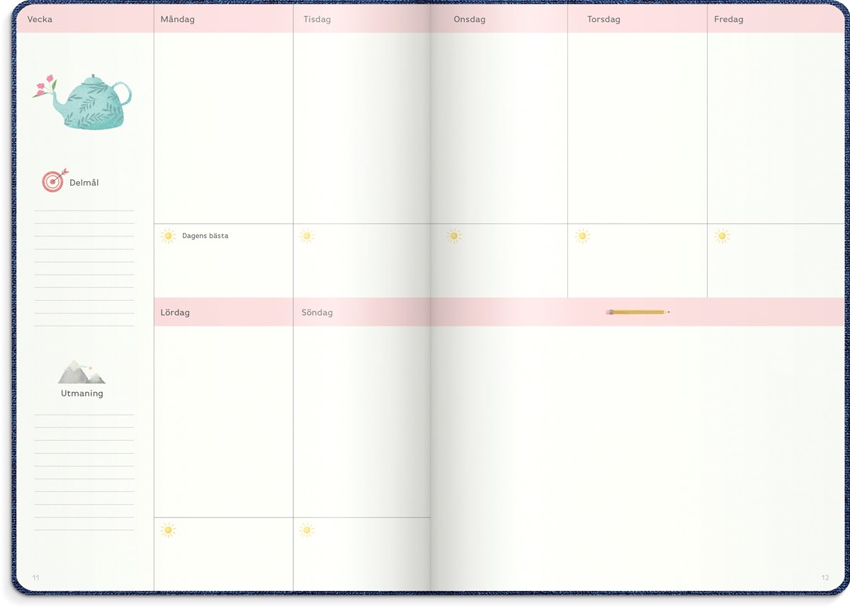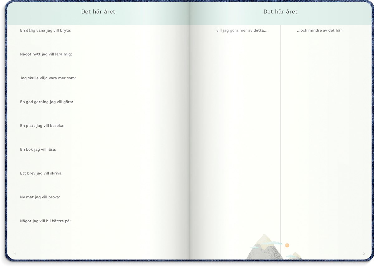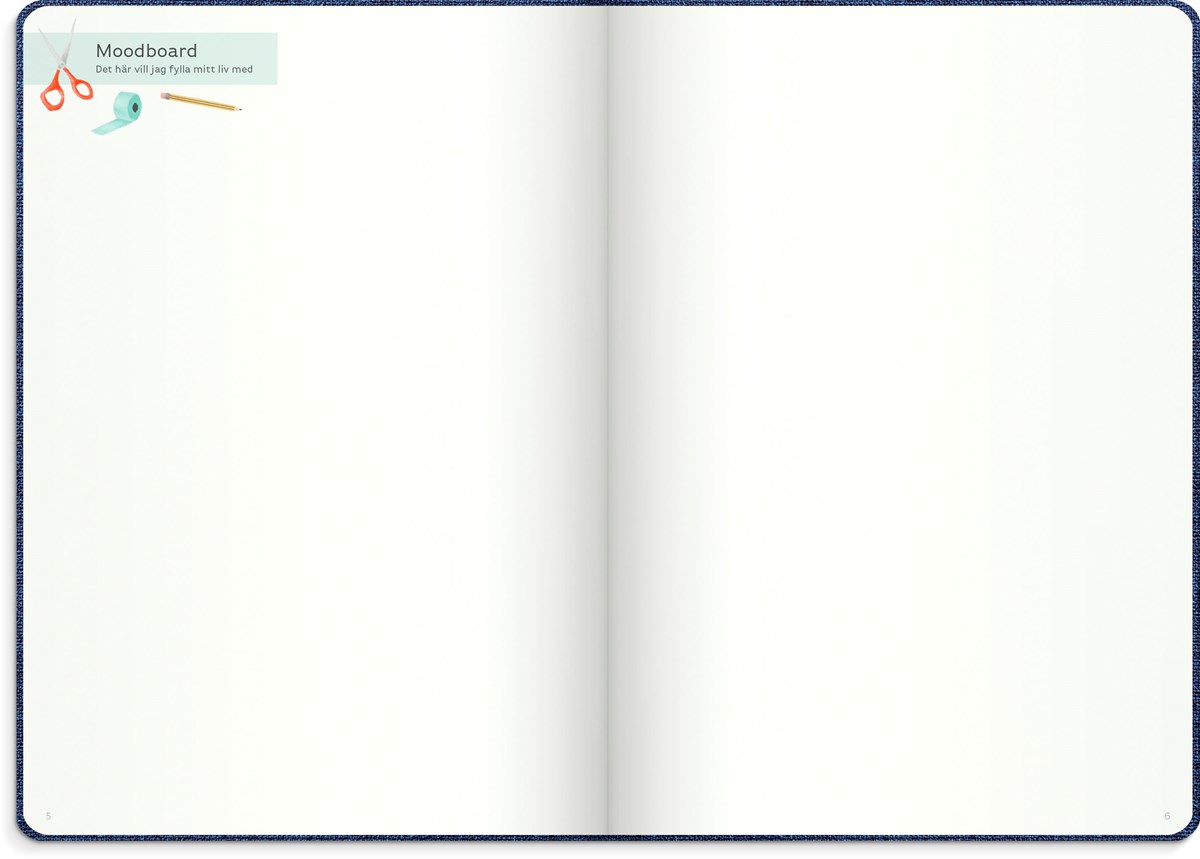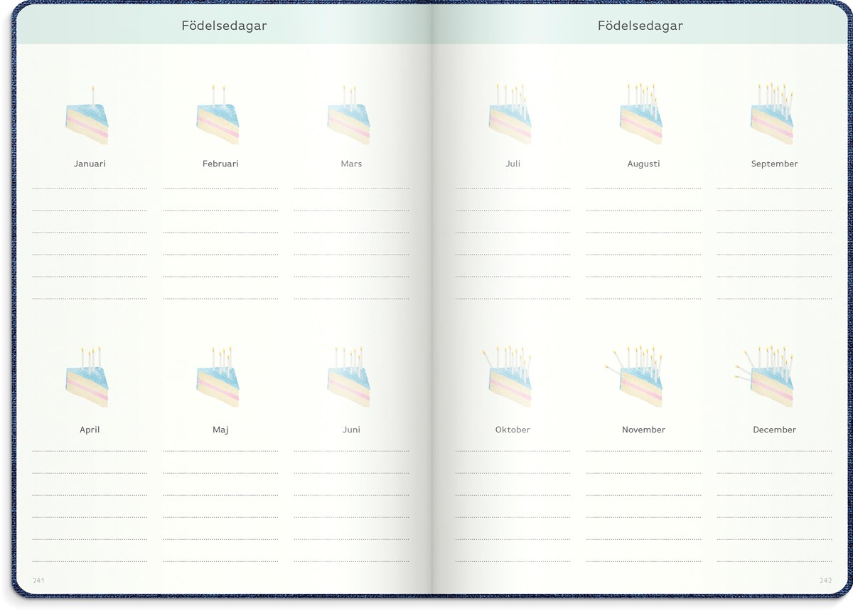 Inbunden odaterad kalender med två märkband. Omslag i blått konstläder och silverprägling. Ett planeringsverktyg för att uppnå sina drömmar och mål. Kalendern innehåller sidor med plats för mål, reflektioner, moodboards, checklistor, bucket lists, födelsedagar och anteckningar. Kalendern är uppbyggd för olika mål: årsmål, halvårsmål, samt delmål månads- och veckovis. Skriv ner månadens prestationer, utmaningar och förbättringar. Kalendern innehåller även prickade sidor för att locka fram användarens mest kreativa sidor. 100 g cremefärgat papper, 128 blad (256 sidor). FSC®-papper. Format: 165x233 mm.