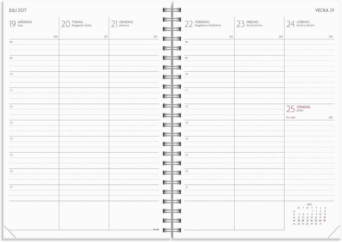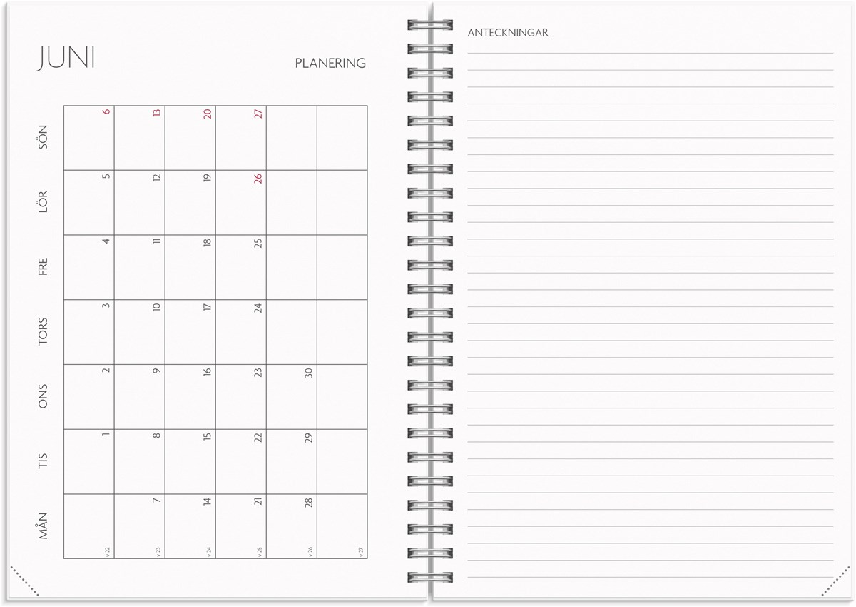Format: A5. Mått: 163 x 17 x 215 mm. Layout: Vecka/uppslag. Stående. Timindelning 8-17. Kalendarium: 2026-06-01 - 2027-08-29. Omslag: Kartong. Spiralbunden. Detaljer: Gummiband. Innehåll: Kyrkliga helgdagar, flaggdagar, helgdagar/aftnar, månfaser, namnsdagar, temadagar/händelser, årsplan/årsplaner, schema, provresultat. Antal sidor: 176. Miljöinformation: FSC®.