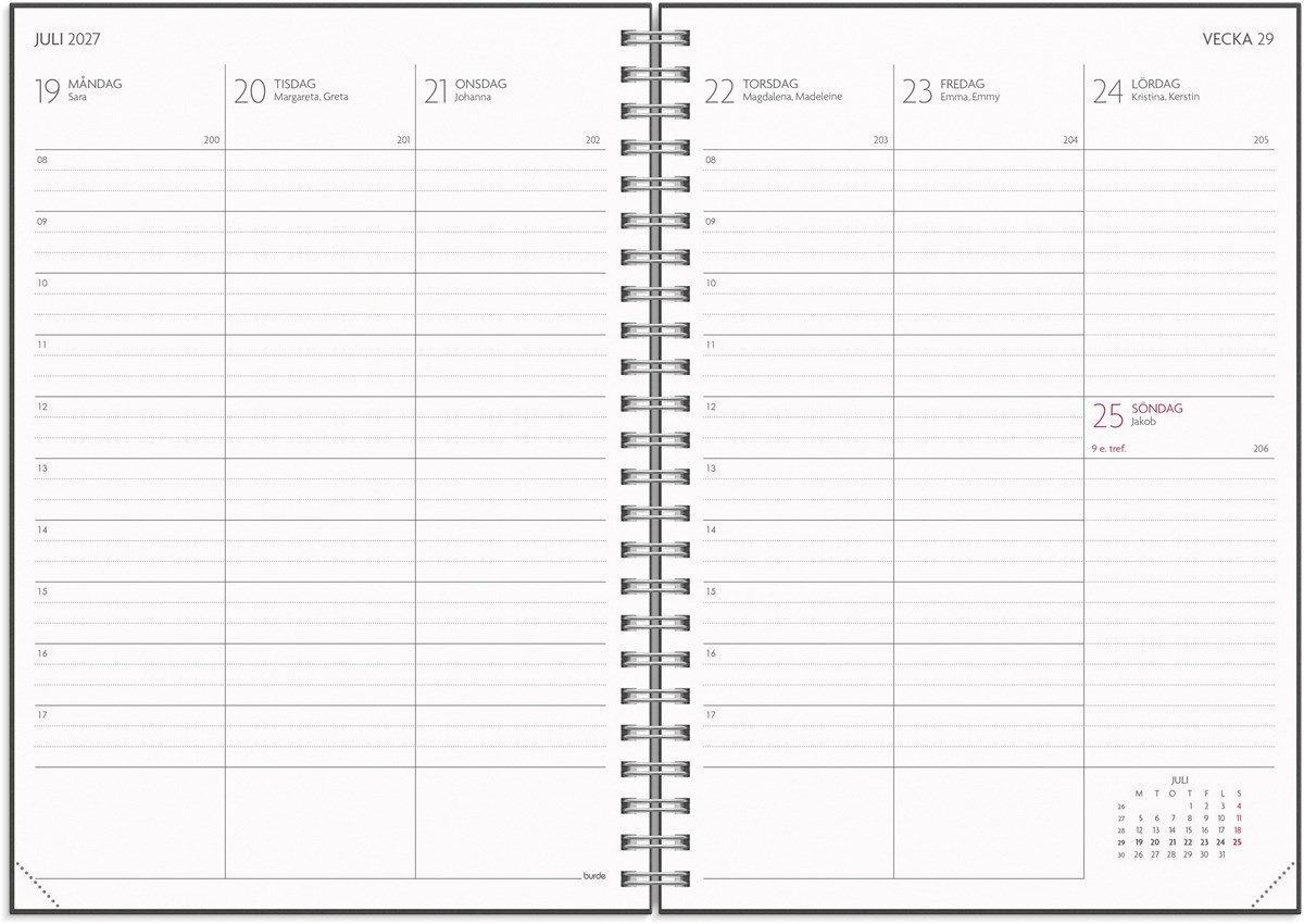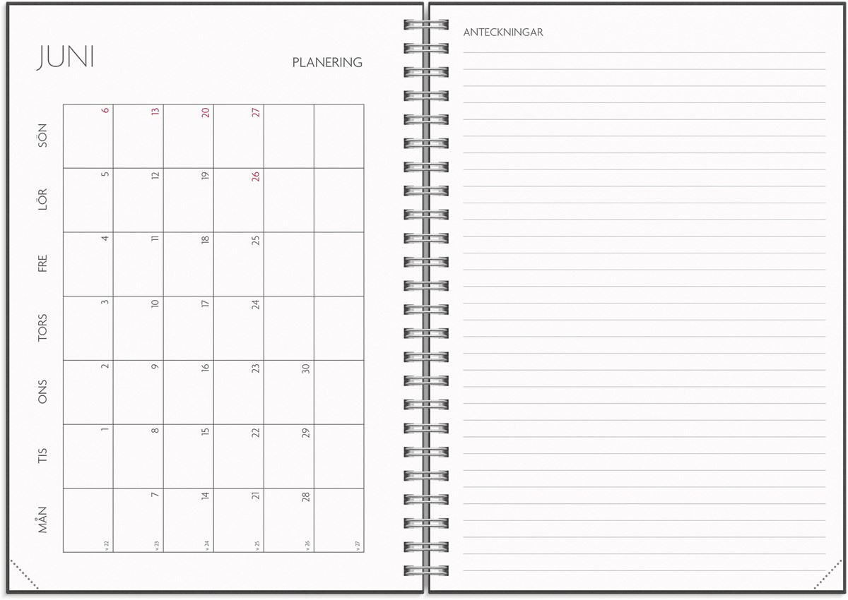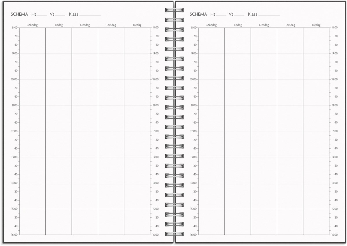 Format: A5. Mått: 215 x 17 x 163 mm. Layout: Vecka/uppslag. Stående. Timindelning 8-17. Kalendarium: 2026-06-01 - 2027-08-29. Omslag: Kartong. Spiralbunden. Detaljer: Gummiband. Pappersficka. Innehåll: Kyrkliga helgdagar, flaggdagar, helgdagar/aftnar, månfaser, namnsdagar, temadagar/händelser, årsplan/årsplaner, schema, provresultat. Antal sidor: 176. Miljöinformation: FSC®.