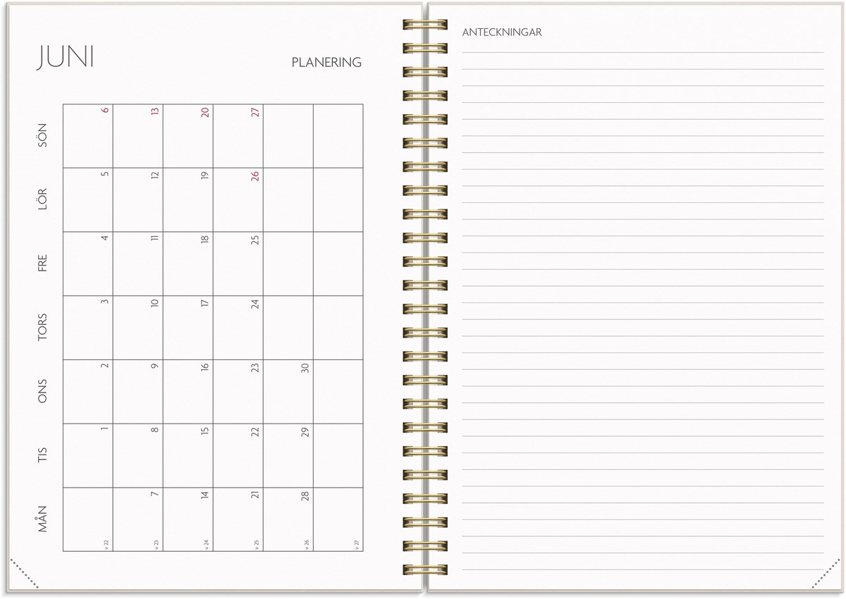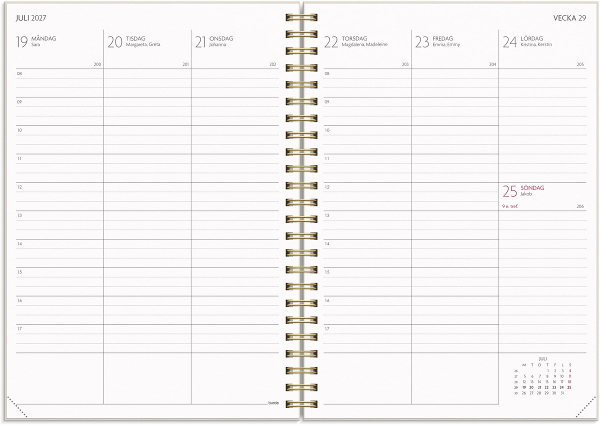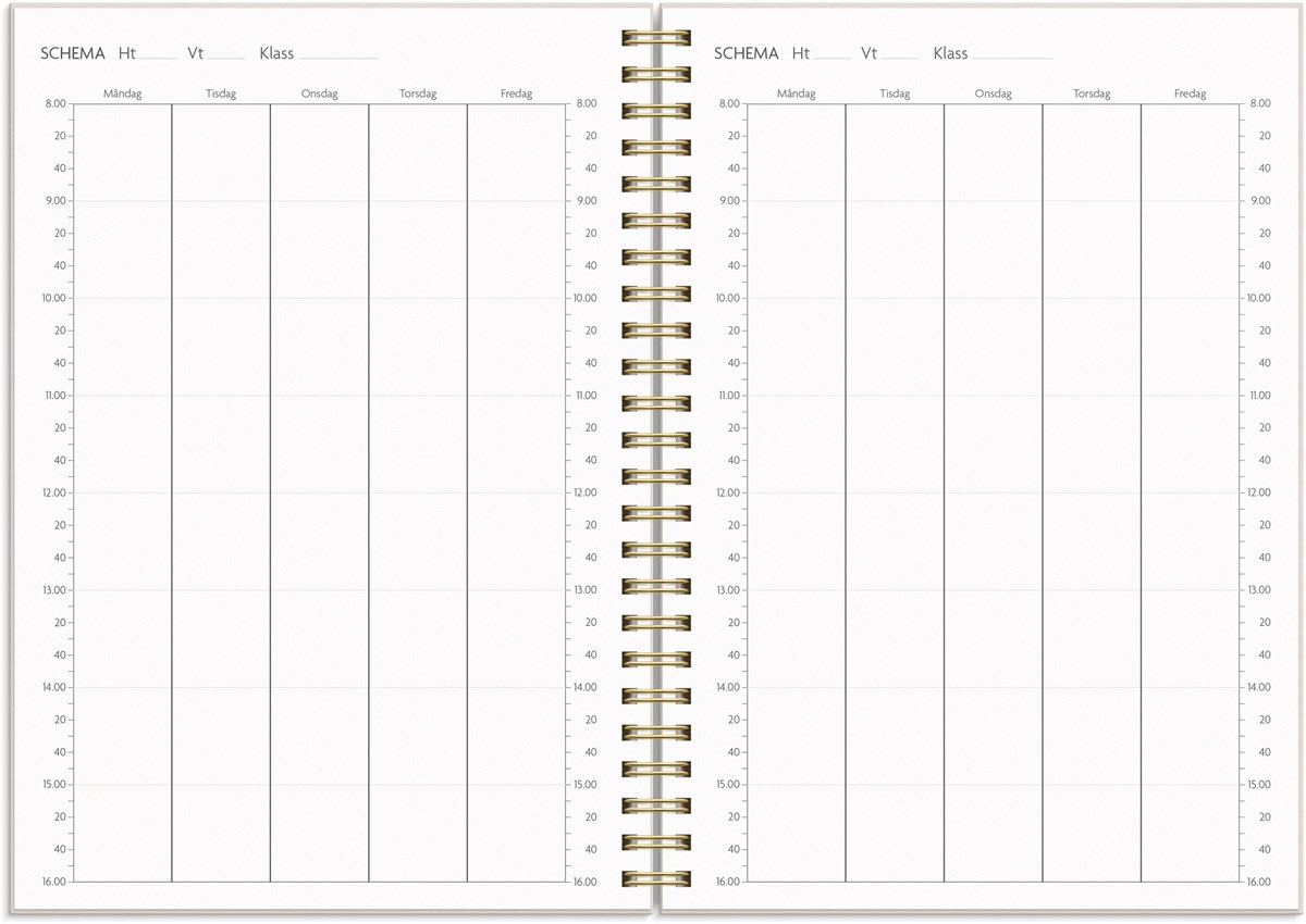 Format: A5. Mått: 17 x 215 x 163 mm. Layout: Vecka/uppslag. Stående. Timindelning 8-17. Kalendarium: 2026-06-01 - 2027-08-29. Omslag: Kartong med struktur. Spiralbunden. Detaljer: Pappersficka. Innehåll: Kyrkliga helgdagar, flaggdagar, helgdagar/aftnar, månfaser, namnsdagar, temadagar/händelser, årsplan/årsplaner, schema, provresultat. Antal sidor: 176. Miljöinformation: FSC®.