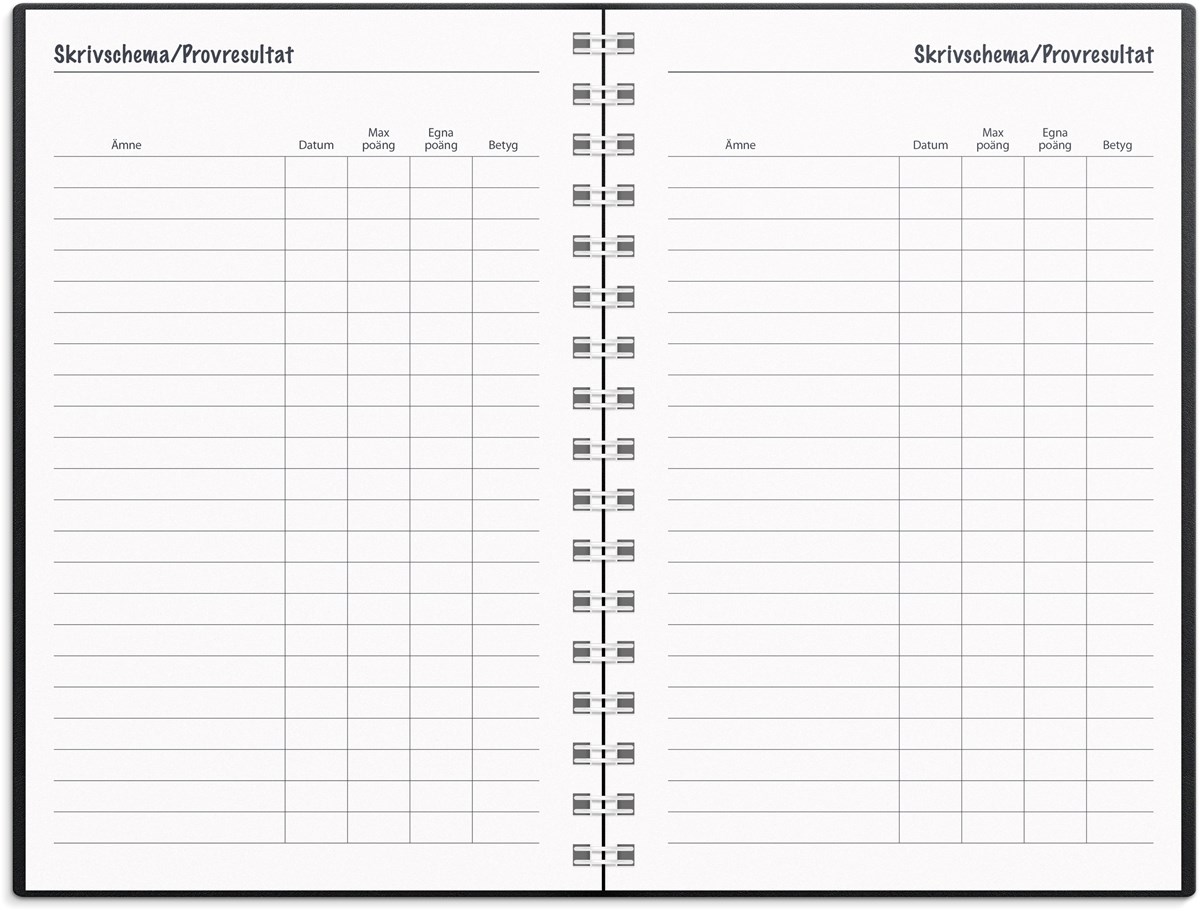 Liten och smidig kalender med svart omslag i plast. Perfekt följeslagare att ha med sig i väskan, eller till och med i fickan. För att ge struktur i studierna innehåller kalendern även sidor där prov samt provresultat kan nedtecknas samt plats för egna anteckningar.