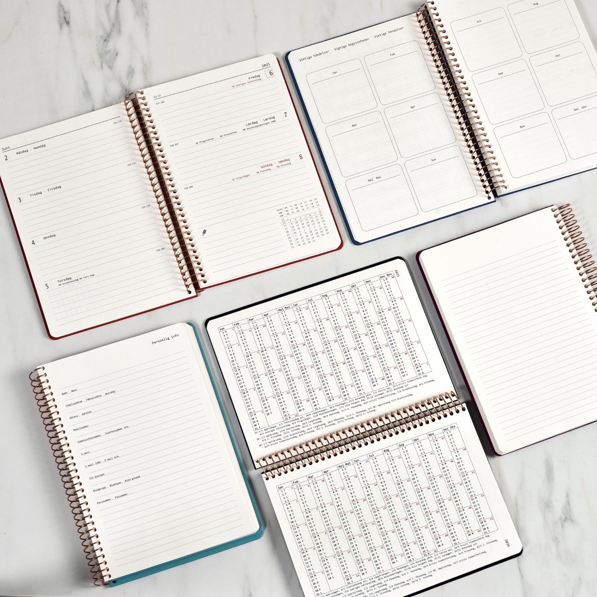 Stilren årskalender som passar för både jobb, skola och vardag i A5 eller A6 format. Välj mellan 5 olika Kozo färger. En vecka per uppslag. Minimalistisk liggande layout med plats för anteckningar i varje uppslag. Innehåller flera sorters årsplaneringar, 12 st månadsöversikter, plats för personlig information och extra linjerade sidor för anteckningar. Årsöversikter med helgdagar för 2026 och 2027.