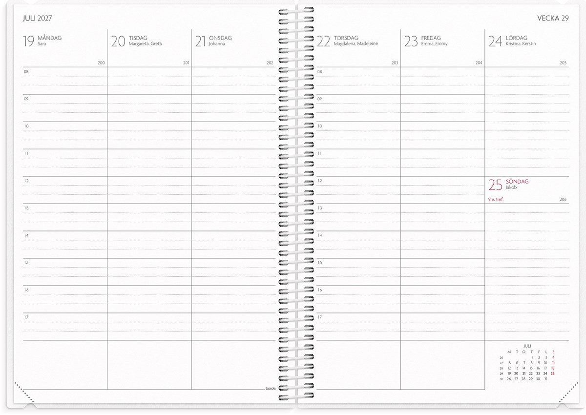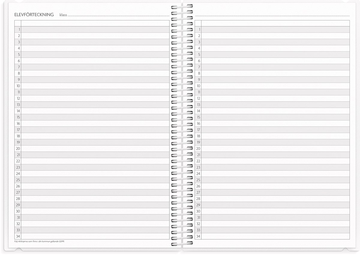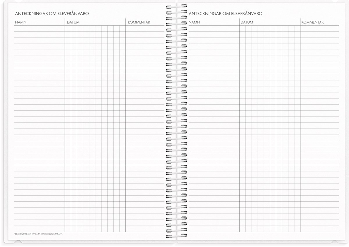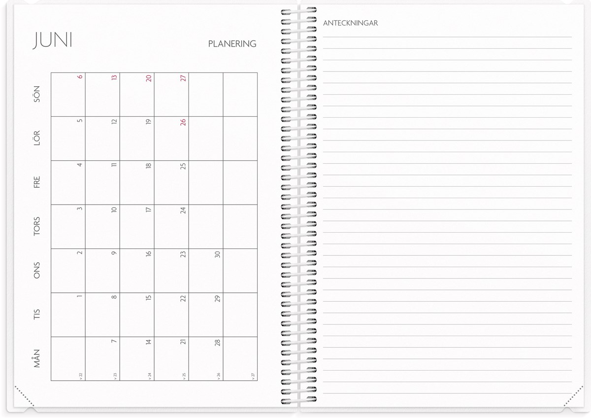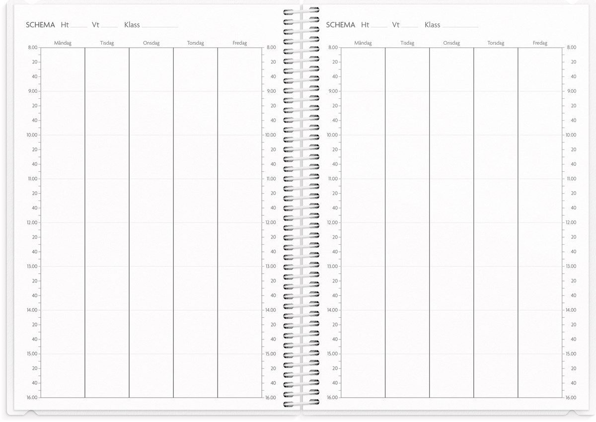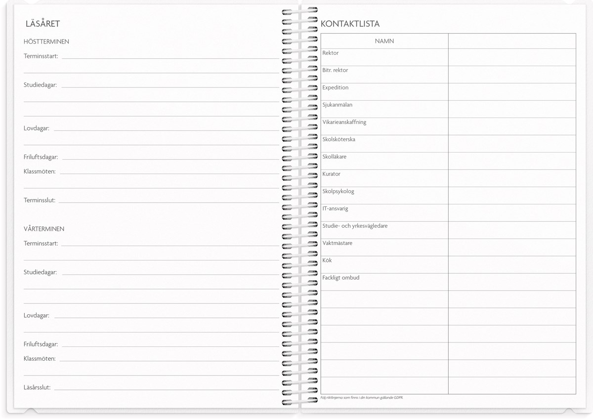 Format: A5. Mått: 15 x 160 x 215 mm. Layout: Vecka/uppslag. Stående. Timindelning 8-17. Kalendarium: 2026-06-01 - 2027-08-29. Omslag: PP-plast och plastficka med tryckt blad. Spiralbunden. Detaljer: Gummiband. Flyttbar plastlinjal. Plastficka. Innehåll: Kyrkliga helgdagar, flaggdagar, helgdagar/aftnar, månfaser, namnsdagar, temadagar/händelser, årsplan/årsplaner, kontaktlista, utvikbar namnlista, anteckningssidor, schema, elevfrånvaro, elevförteckning, provresultat. Antal sidor: 232. Miljöinformation: FSC®.