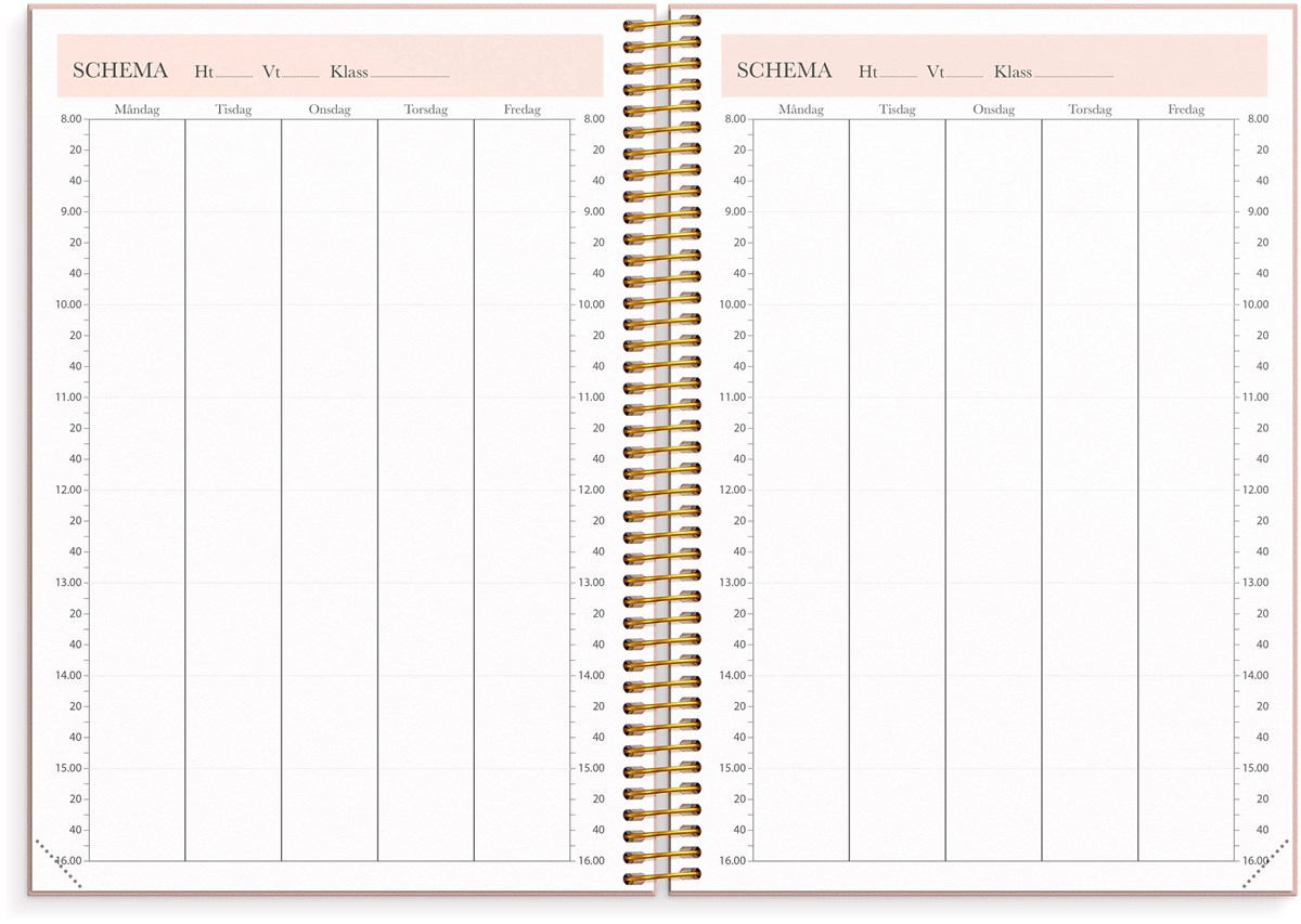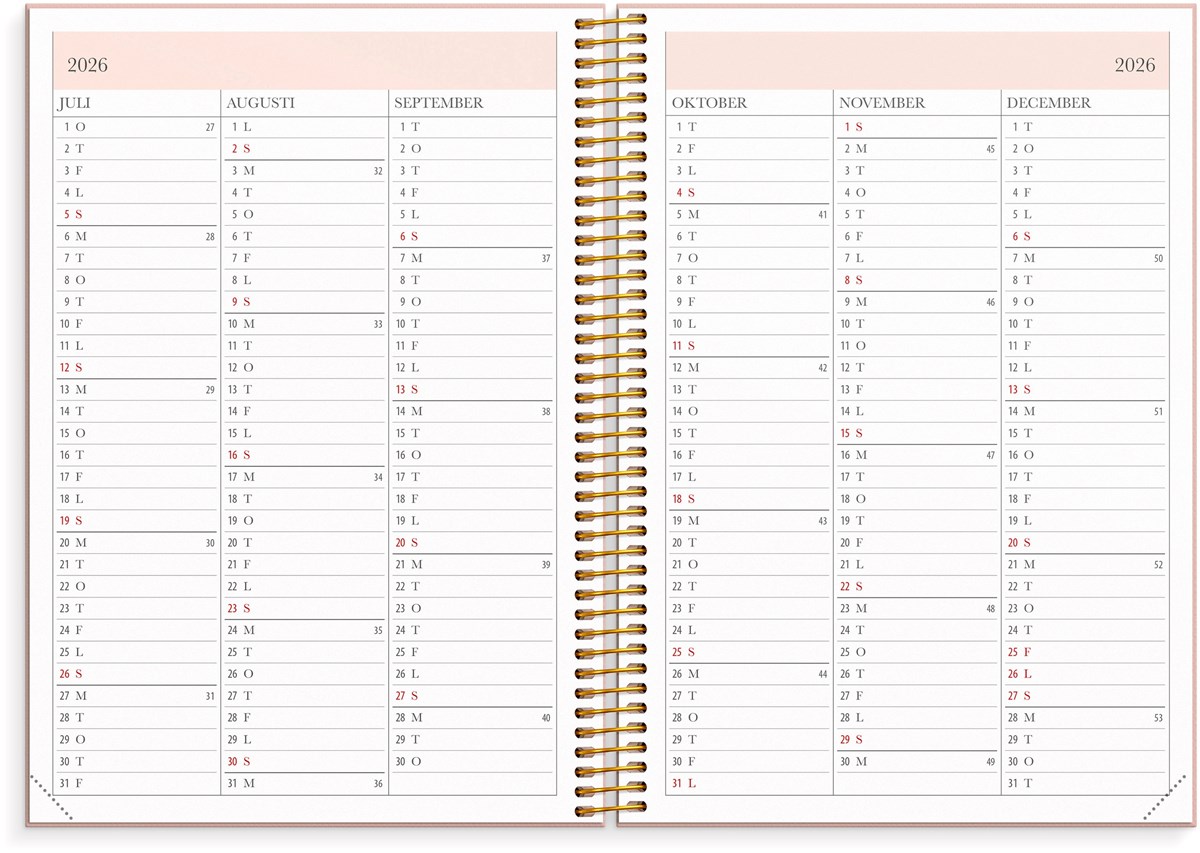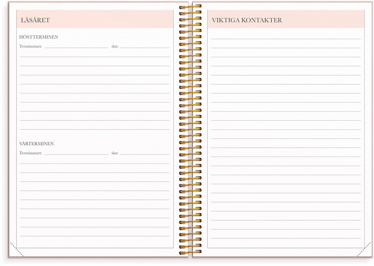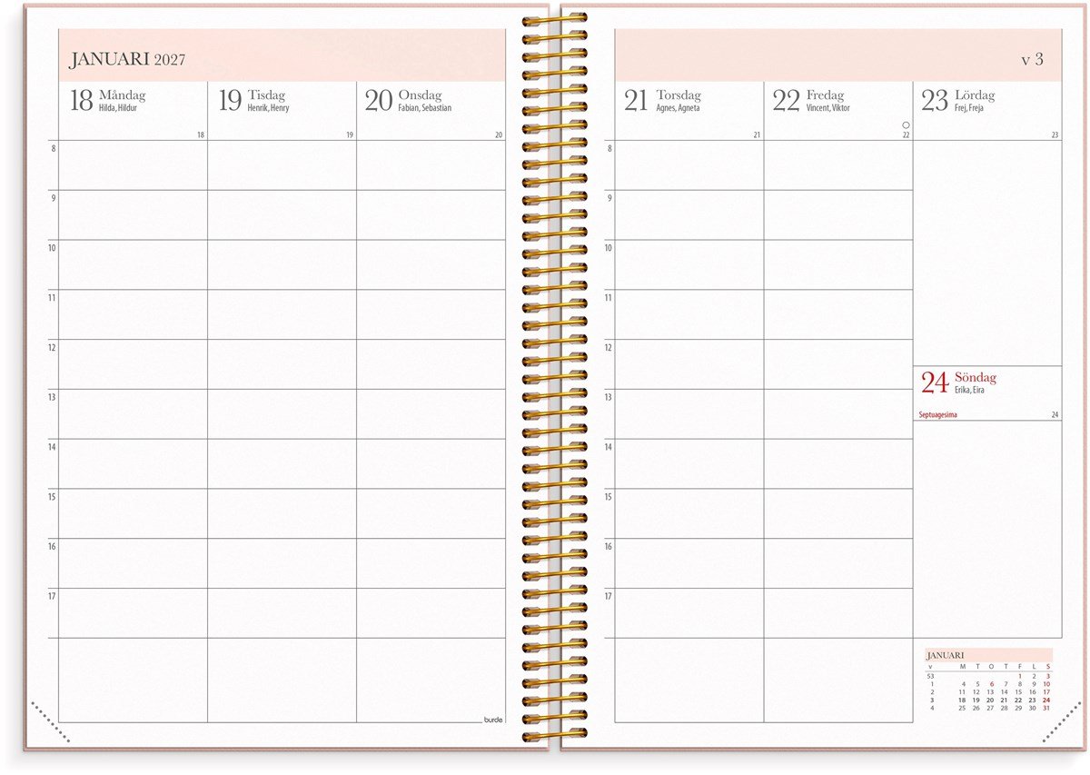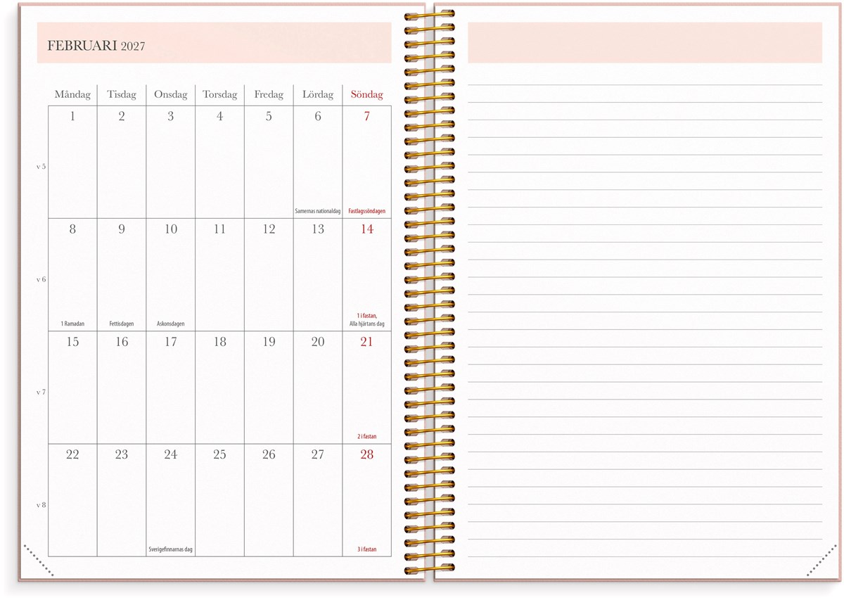 Format: A5. Mått: 215 x 25 x 175 mm. Layout: Vecka/uppslag. Stående. Timindelning 8-17. Kalendarium: 2026-06-15 - 2027-08-01. Omslag: Kartong med struktur. Spiralbunden. Detaljer: Gummiband. Flyttbara plastmarkörer. Pappersficka. Innehåll: Kyrkliga helgdagar, flaggdagar, helgdagar/aftnar, viktiga datum, månfaser, namnsdagar, temadagar/händelser, årsöversikt/årsöversikter, årsplan/årsplaner, kontaktlista, schema. Antal sidor: 224. Miljöinformation: FSC®.